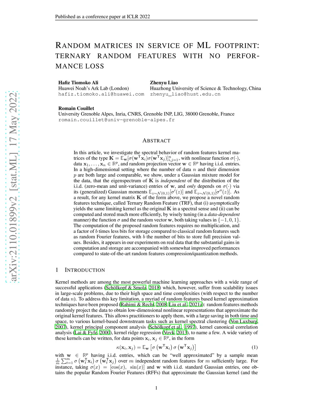 In this article, we investigate the spectral behavior of random features kernel matrices of the type , with nonlinear function , data , and random projection vector having i.i.d. entries. In a high-dimensional setting where the number of data and their dimension are both large and comparable, we show, under a Gaussian mixture model for the data, that the eigenspectrum of is independent of the distribution of the i.i.d.(zero-mean and unit-variance) entries of , and only depends on via its (generalized) Gaussian moments and . As a result, for any kernel matrix of the form above, we propose a novel random features technique, called Ternary Random Feature (TRF), that (i) asymptotically yields the same limiting kernel as the original in a spectral sense and (ii) can be computed and stored much more efficiently, by wisely tuning (in a data-dependent manner) the function and the random vector , both taking values in . The computation of the proposed random features requires no multiplication, and a factor of times less bits for storage compared to classical random features such as random Fourier features, with the number of bits to store full precision values. Besides, it appears in our experiments on real data that the substantial gains in computation and storage are accompanied with somewhat improved performances compared to state-of-the-art random features compression/quantization methods.