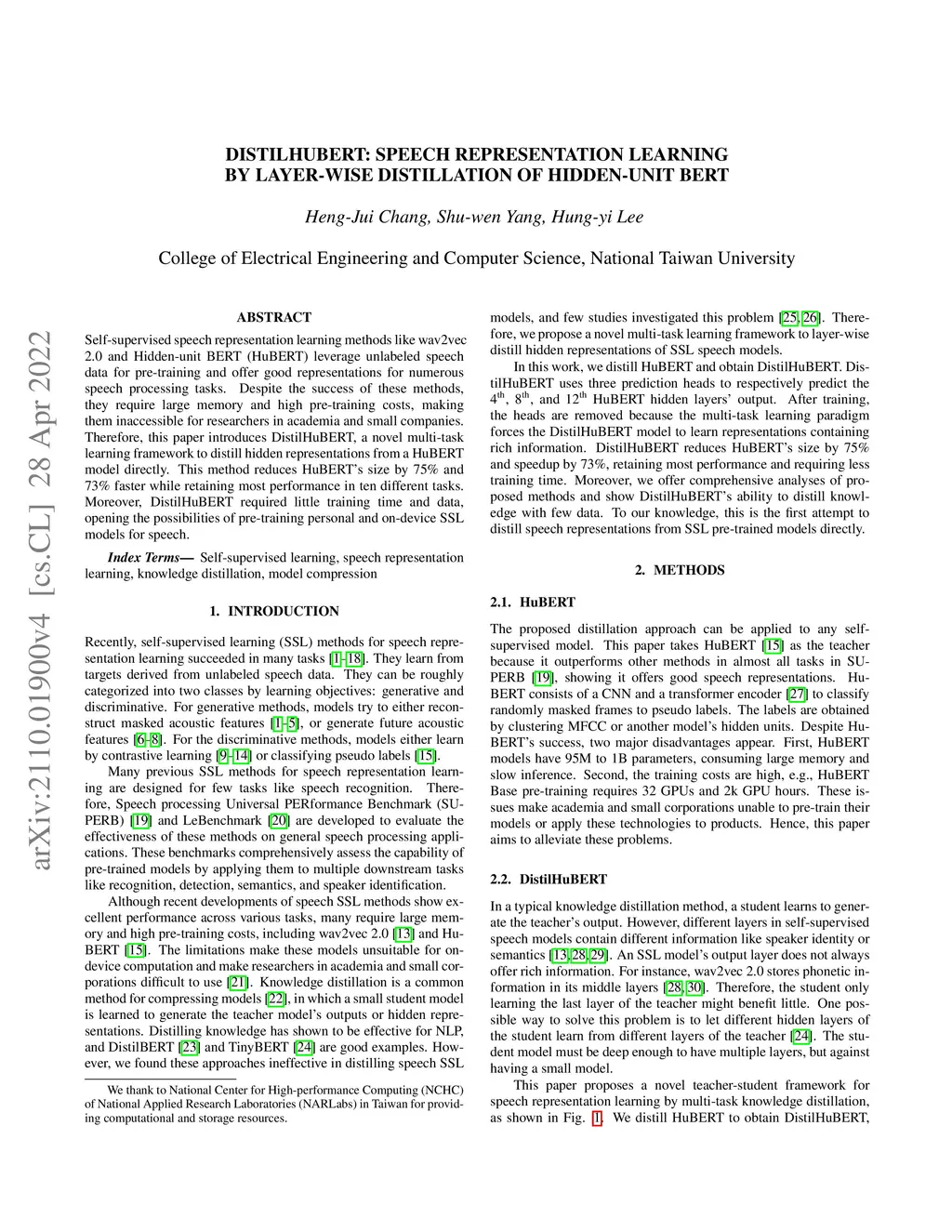 DistilHuBERT: Speech Representation Learning by Layer-wise Distillation