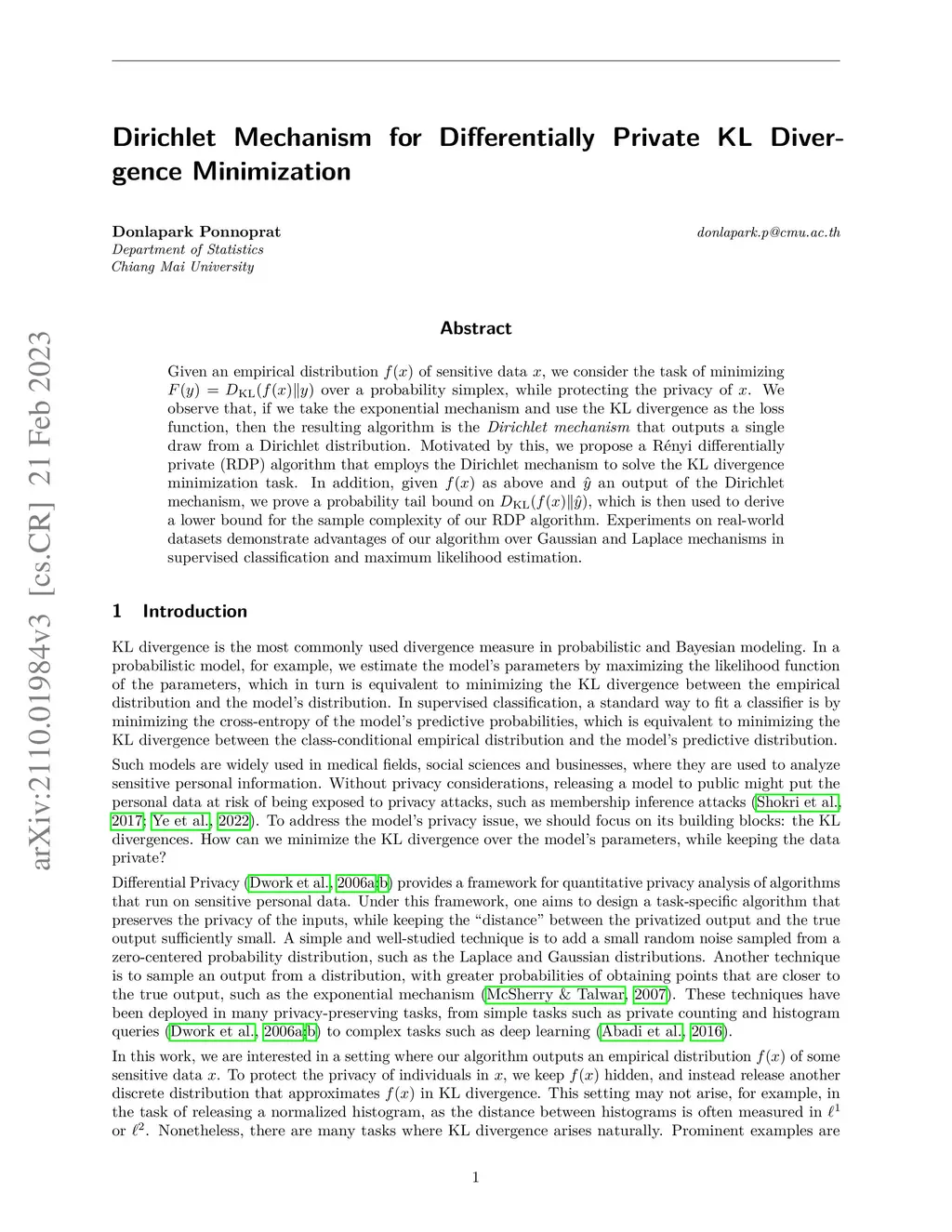 Given an empirical distribution of sensitive data , we consider the task of minimizing over a probability simplex, while protecting the privacy of . We observe that, if we take the exponential mechanism and use the KL divergence as the loss function, then the resulting algorithm is the Dirichlet mechanism that outputs a single draw from a Dirichlet distribution. Motivated by this, we propose a R\ényi differentially private (RDP) algorithm that employs the Dirichlet mechanism to solve the KL divergence minimization task. In addition, given as above and an output of the Dirichlet mechanism, we prove a probability tail bound on , which is then used to derive a lower bound for the sample complexity of our RDP algorithm. Experiments on real-world datasets demonstrate advantages of our algorithm over Gaussian and Laplace mechanisms in supervised classification and maximum likelihood estimation.
