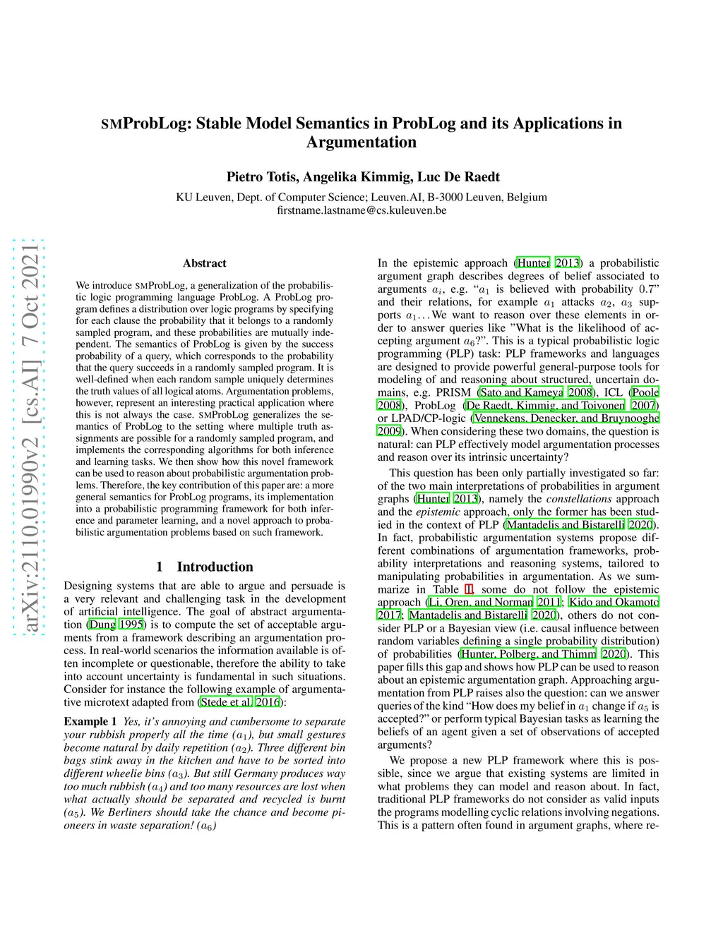 We introduce SMProbLog, a generalization of the probabilistic logic programming language ProbLog. A ProbLog program defines a distribution over logic programs by specifying for each clause the probability that it belongs to a randomly sampled program, and these probabilities are mutually independent. The semantics of ProbLog is given by the success probability of a query, which corresponds to the probability that the query succeeds in a randomly sampled program. It is well-defined when each random sample uniquely determines the truth values of all logical atoms. Argumentation problems, however, represent an interesting practical application where this is not always the case. SMProbLog generalizes the semantics of ProbLog to the setting where multiple truth assignments are possible for a randomly sampled program, and implements the corresponding algorithms for both inference and learning tasks. We then show how this novel framework can be used to reason about probabilistic argumentation problems. Therefore, the key contribution of this paper are: a more general semantics for ProbLog programs, its implementation into a probabilistic programming framework for both inference and parameter learning, and a novel approach to probabilistic argumentation problems based on such framework.