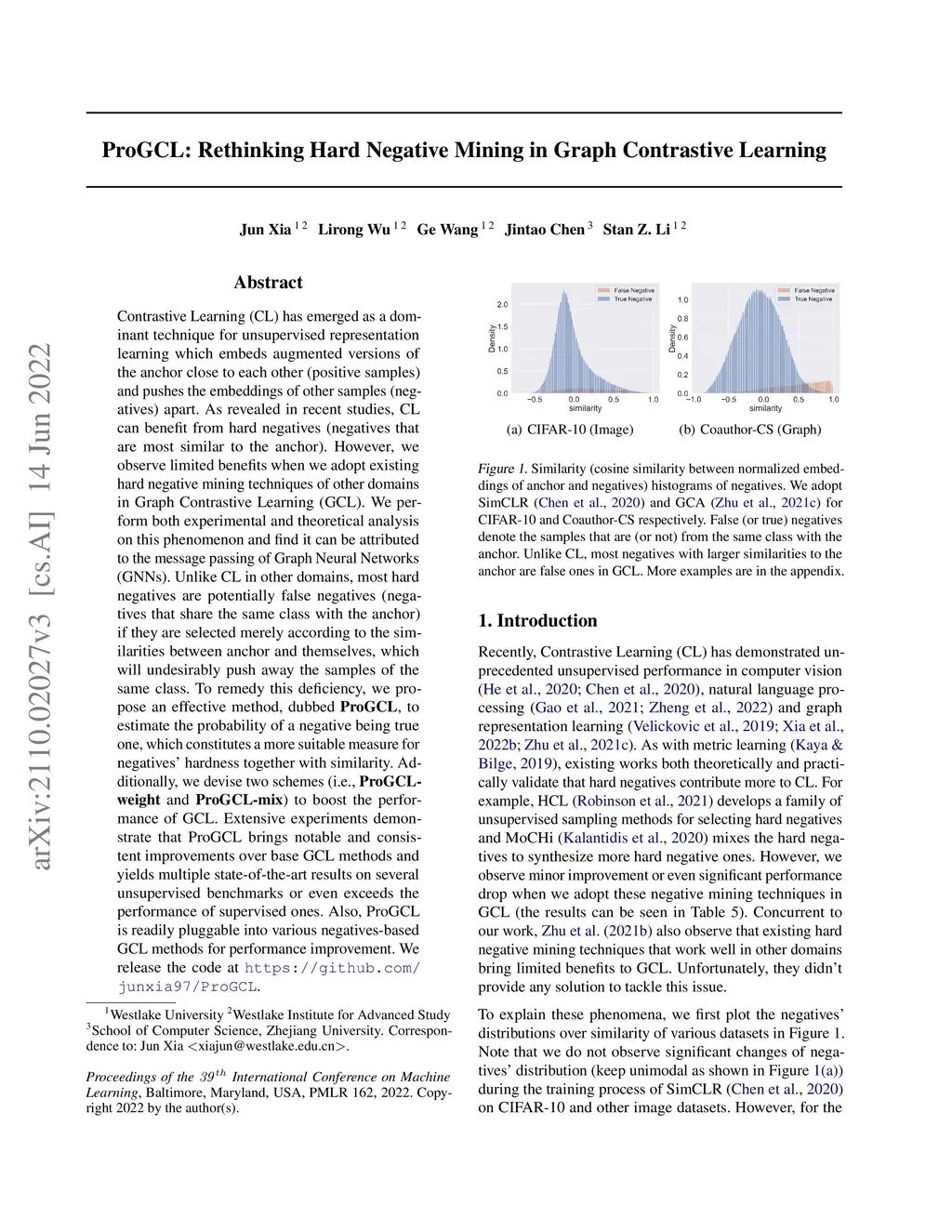 Contrastive Learning (CL) has emerged as a dominant technique for unsupervised representation learning which embeds augmented versions of the anchor close to each other (positive samples) and pushes the embeddings of other samples (negatives) apart. As revealed in recent studies, CL can benefit from hard negatives (negatives that are most similar to the anchor). However, we observe limited benefits when we adopt existing hard negative mining techniques of other domains in Graph Contrastive Learning (GCL). We perform both experimental and theoretical analysis on this phenomenon and find it can be attributed to the message passing of Graph Neural Networks (GNNs). Unlike CL in other domains, most hard negatives are potentially false negatives (negatives that share the same class with the anchor) if they are selected merely according to the similarities between anchor and themselves, which will undesirably push away the samples of the same class. To remedy this deficiency, we propose an effective method, dubbed \textbf{ProGCL}, to estimate the probability of a negative being true one, which constitutes a more suitable measure for negatives' hardness together with similarity. Additionally, we devise two schemes (i.e., \textbf{ProGCL-weight} and \textbf{ProGCL-mix}) to boost the performance of GCL. Extensive experiments demonstrate that ProGCL brings notable and consistent improvements over base GCL methods and yields multiple state-of-the-art results on several unsupervised benchmarks or even exceeds the performance of supervised ones. Also, ProGCL is readily pluggable into various negatives-based GCL methods for performance improvement. We release the code at \textcolor{magenta}{\url{https://github.com/junxia97/ProGCL}}.