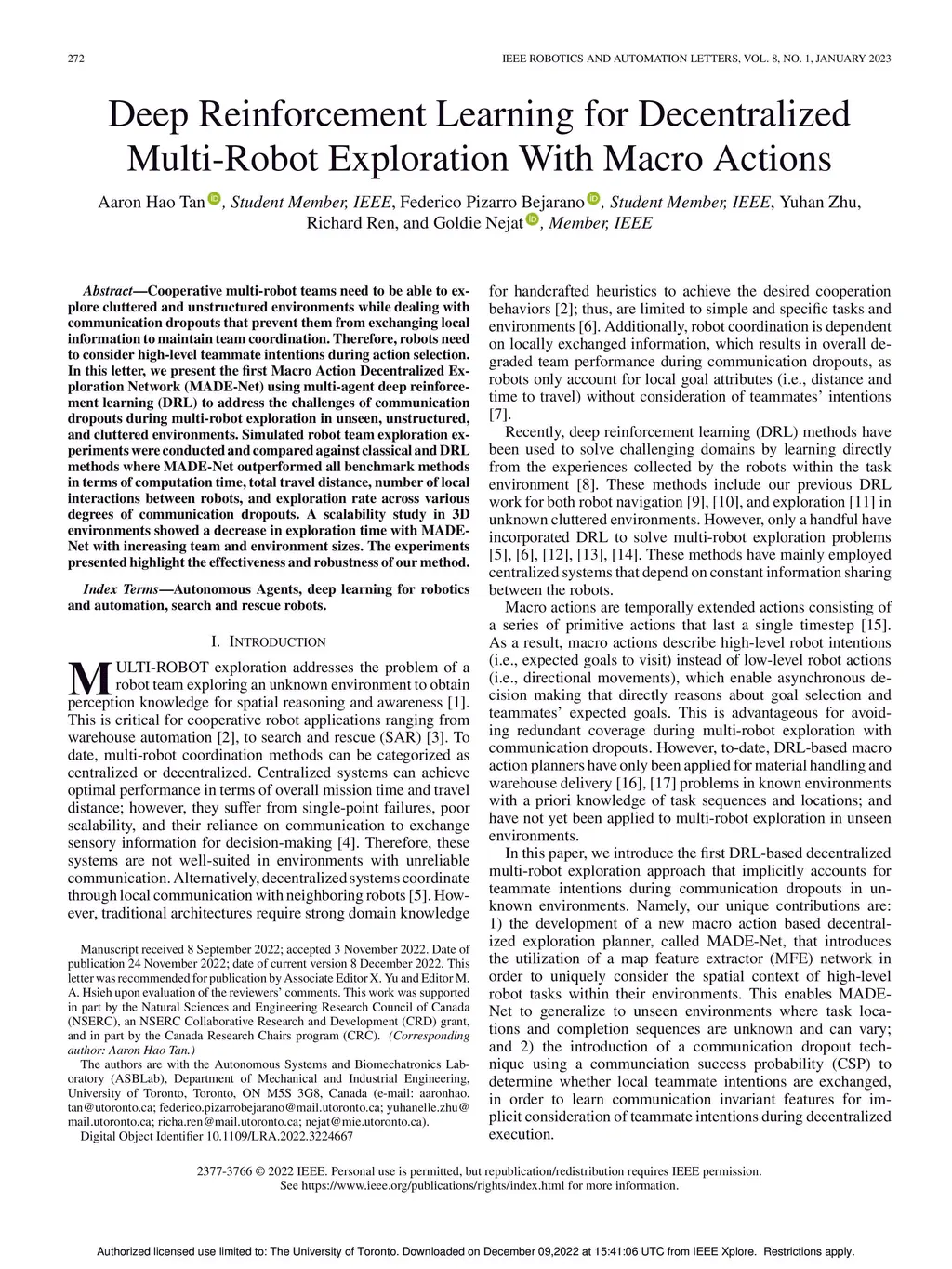 Cooperative multi-robot teams need to be able to explore cluttered and unstructured environments while dealing with communication dropouts that prevent them from exchanging local information to maintain team coordination. Therefore, robots need to consider high-level teammate intentions during action selection. In this letter, we present the first Macro Action Decentralized Exploration Network (MADE-Net) using multi-agent deep reinforcement learning (DRL) to address the challenges of communication dropouts during multi-robot exploration in unseen, unstructured, and cluttered environments. Simulated robot team exploration experiments were conducted and compared against classical and DRL methods where MADE-Net outperformed all benchmark methods in terms of computation time, total travel distance, number of local interactions between robots, and exploration rate across various degrees of communication dropouts. A scalability study in 3D environments showed a decrease in exploration time with MADE-Net with increasing team and environment sizes. The experiments presented highlight the effectiveness and robustness of our method.
