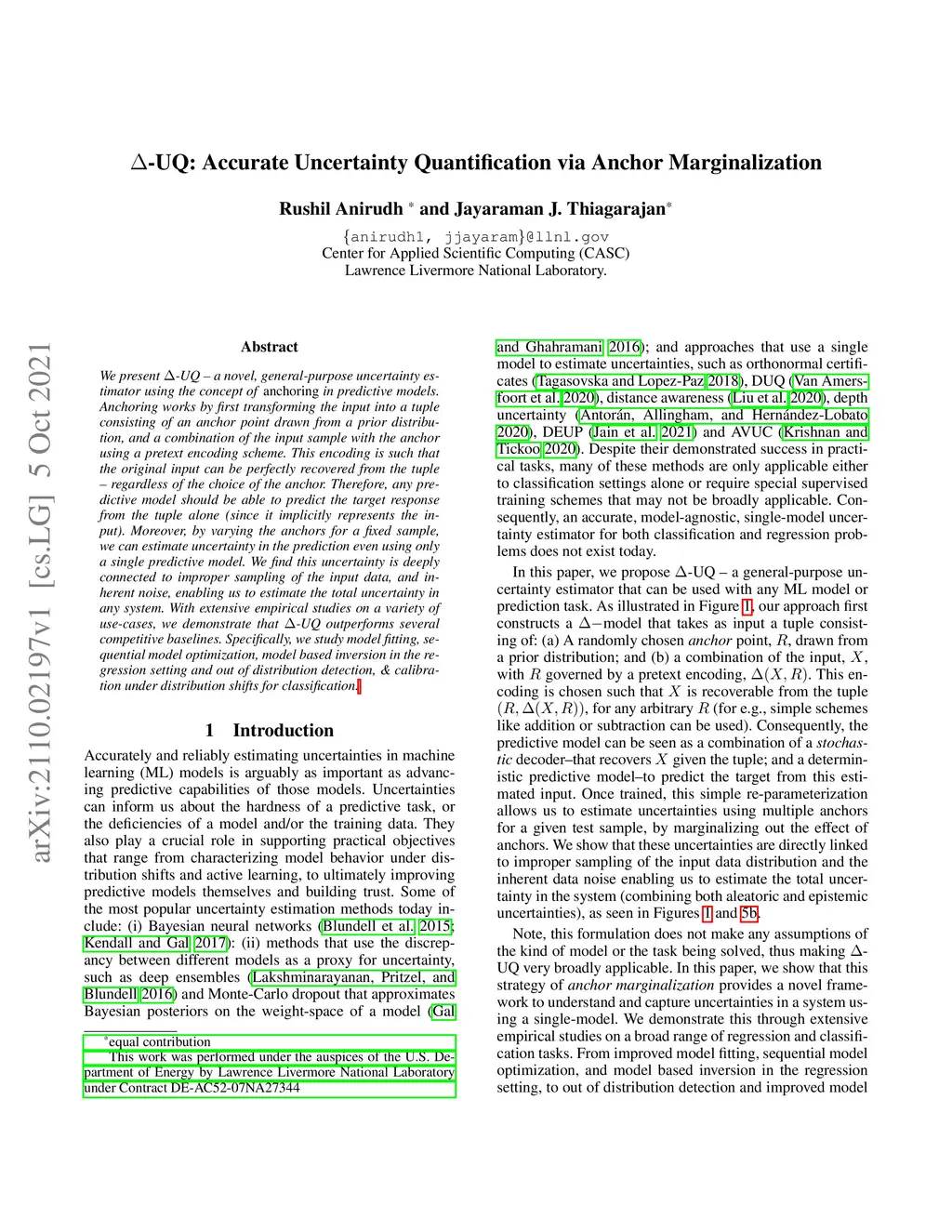 We present -UQ -- a novel, general-purpose uncertainty estimator using the concept of anchoring in predictive models. Anchoring works by first transforming the input into a tuple consisting of an anchor point drawn from a prior distribution, and a combination of the input sample with the anchor using a pretext encoding scheme. This encoding is such that the original input can be perfectly recovered from the tuple -- regardless of the choice of the anchor. Therefore, any predictive model should be able to predict the target response from the tuple alone (since it implicitly represents the input). Moreover, by varying the anchors for a fixed sample, we can estimate uncertainty in the prediction even using only a single predictive model. We find this uncertainty is deeply connected to improper sampling of the input data, and inherent noise, enabling us to estimate the total uncertainty in any system. With extensive empirical studies on a variety of use-cases, we demonstrate that -UQ outperforms several competitive baselines. Specifically, we study model fitting, sequential model optimization, model based inversion in the regression setting and out of distribution detection, & calibration under distribution shifts for classification.