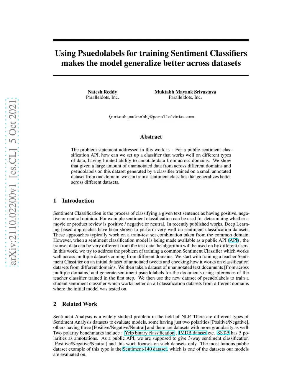 The problem statement addressed in this work is : For a public sentiment classification API, how can we set up a classifier that works well on different types of data, having limited ability to annotate data from across domains. We show that given a large amount of unannotated data from across different domains and pseudolabels on this dataset generated by a classifier trained on a small annotated dataset from one domain, we can train a sentiment classifier that generalizes better across different datasets.