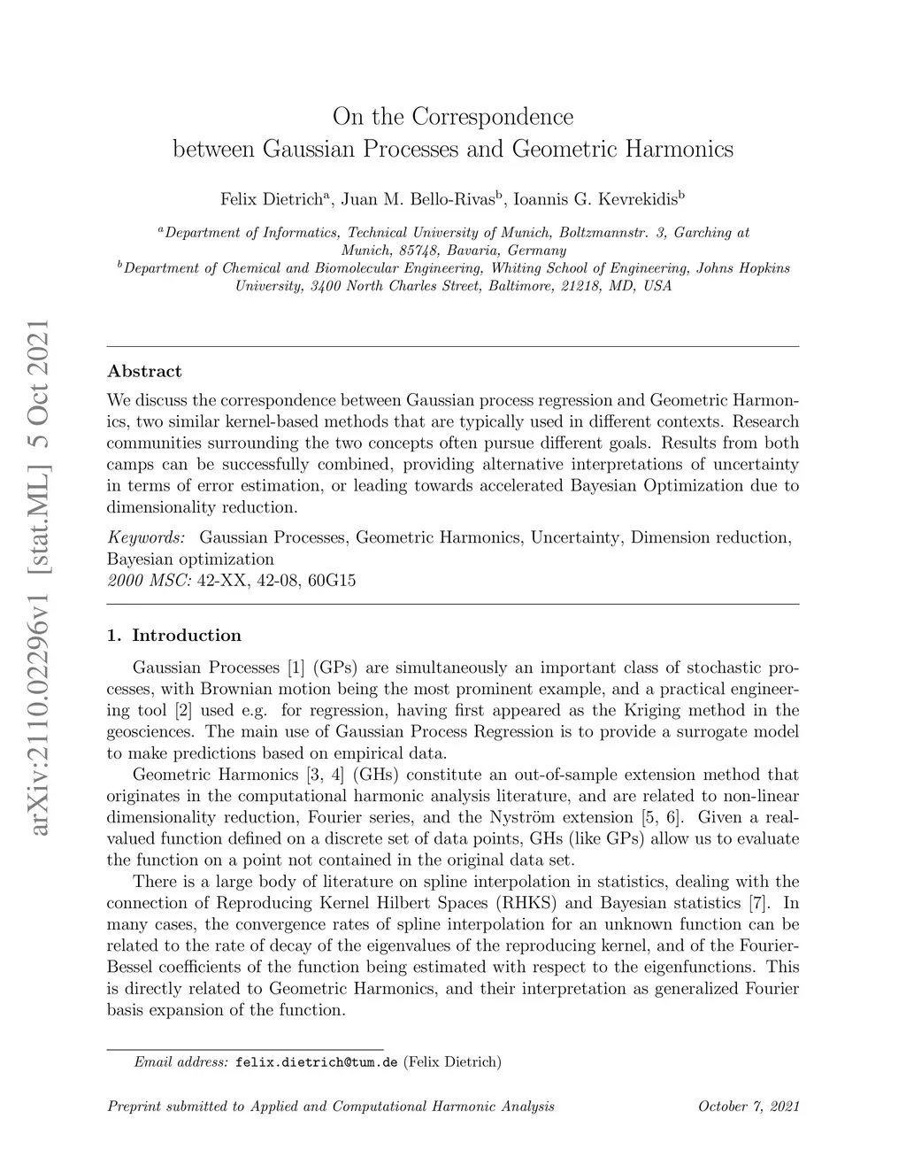 We discuss the correspondence between Gaussian process regression and Geometric Harmonics, two similar kernel-based methods that are typically used in different contexts. Research communities surrounding the two concepts often pursue different goals. Results from both camps can be successfully combined, providing alternative interpretations of uncertainty in terms of error estimation, or leading towards accelerated Bayesian Optimization due to dimensionality reduction.