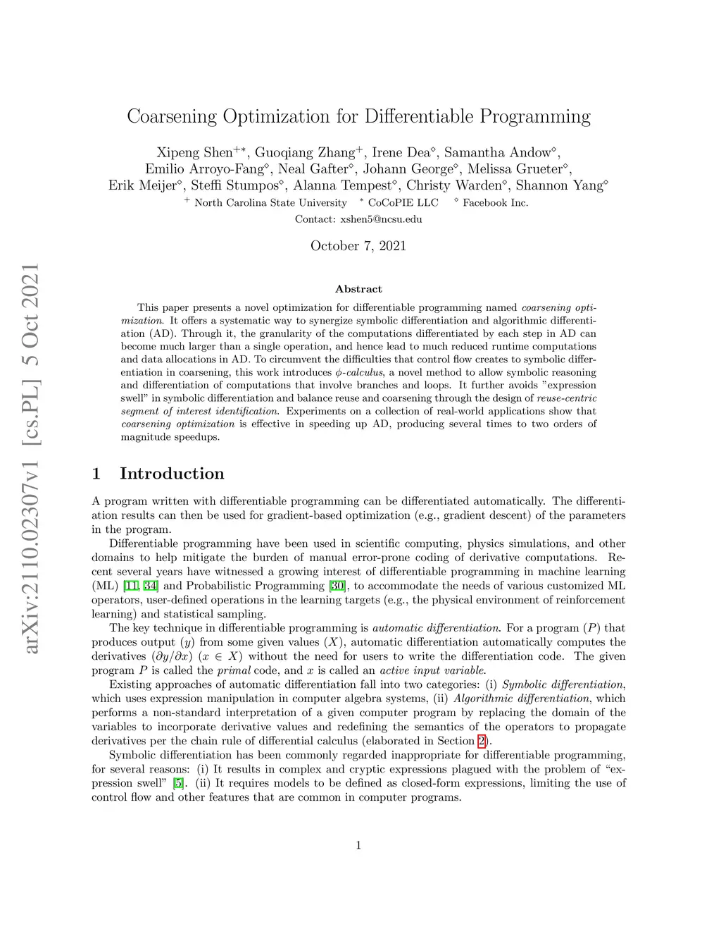 This paper presents a novel optimization for differentiable programming named coarsening optimization. It offers a systematic way to synergize symbolic differentiation and algorithmic differentiation (AD). Through it, the granularity of the computations differentiated by each step in AD can become much larger than a single operation, and hence lead to much reduced runtime computations and data allocations in AD. To circumvent the difficulties that control flow creates to symbolic differentiation in coarsening, this work introduces phi-calculus, a novel method to allow symbolic reasoning and differentiation of computations that involve branches and loops. It further avoids "expression swell" in symbolic differentiation and balance reuse and coarsening through the design of reuse-centric segment of interest identification. Experiments on a collection of real-world applications show that coarsening optimization is effective in speeding up AD, producing several times to two orders of magnitude speedups.