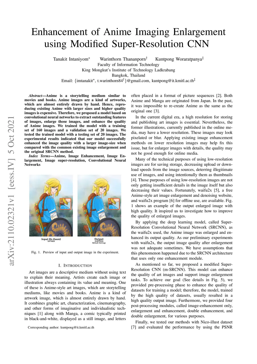 Anime is a storytelling medium similar to movies and books. Anime images are a kind of artworks, which are almost entirely drawn by hand. Hence, reproducing existing Anime with larger sizes and higher quality images is expensive. Therefore, we proposed a model based on convolutional neural networks to extract outstanding features of images, enlarge those images, and enhance the quality of Anime images. We trained the model with a training set of 160 images and a validation set of 20 images. We tested the trained model with a testing set of 20 images. The experimental results indicated that our model successfully enhanced the image quality with a larger image-size when compared with the common existing image enlargement and the original SRCNN method.