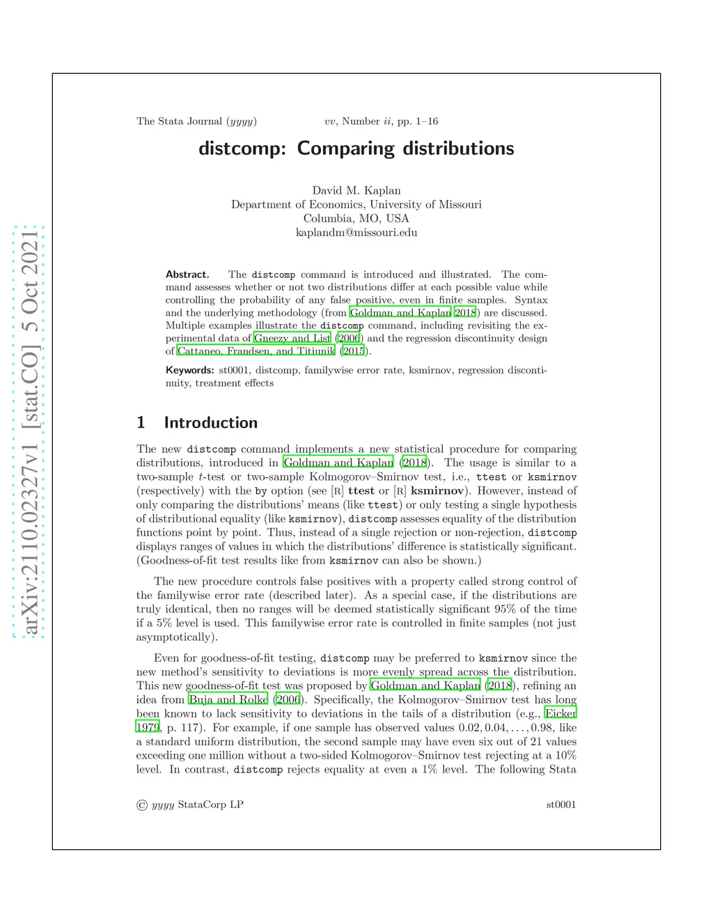 The distcomp command is introduced and illustrated. The command assesses whether or not two distributions differ at each possible value while controlling the probability of any false positive, even in finite samples. Syntax and the underlying methodology (from Goldman and Kaplan, 2018) are discussed. Multiple examples illustrate the distcomp command, including revisiting the experimental data of Gneezy and List (2006) and the regression discontinuity design of Cattaneo, Frandsen, and Titiunik (2015).