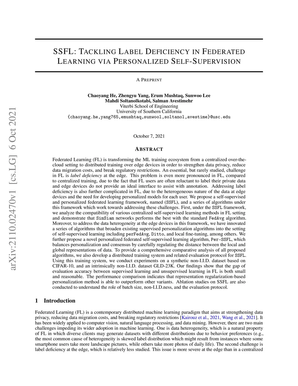 Federated Learning (FL) is transforming the ML training ecosystem from a centralized over-the-cloud setting to distributed training over edge devices in order to strengthen data privacy. An essential but rarely studied challenge in FL is label deficiency at the edge. This problem is even more pronounced in FL compared to centralized training due to the fact that FL users are often reluctant to label their private data. Furthermore, due to the heterogeneous nature of the data at edge devices, it is crucial to develop personalized models. In this paper we propose self-supervised federated learning (SSFL), a unified self-supervised and personalized federated learning framework, and a series of algorithms under this framework which work towards addressing these challenges. First, under the SSFL framework, we demonstrate that the standard FedAvg algorithm is compatible with recent breakthroughs in centralized self-supervised learning such as SimSiam networks. Moreover, to deal with data heterogeneity at the edge devices in this framework, we have innovated a series of algorithms that broaden existing supervised personalization algorithms into the setting of self-supervised learning. We further propose a novel personalized federated self-supervised learning algorithm, Per-SSFL, which balances personalization and consensus by carefully regulating the distance between the local and global representations of data. To provide a comprehensive comparative analysis of all proposed algorithms, we also develop a distributed training system and related evaluation protocol for SSFL. Our findings show that the gap of evaluation accuracy between supervised learning and unsupervised learning in FL is both small and reasonable. The performance comparison indicates the representation regularization-based personalization method is able to outperform other variants.