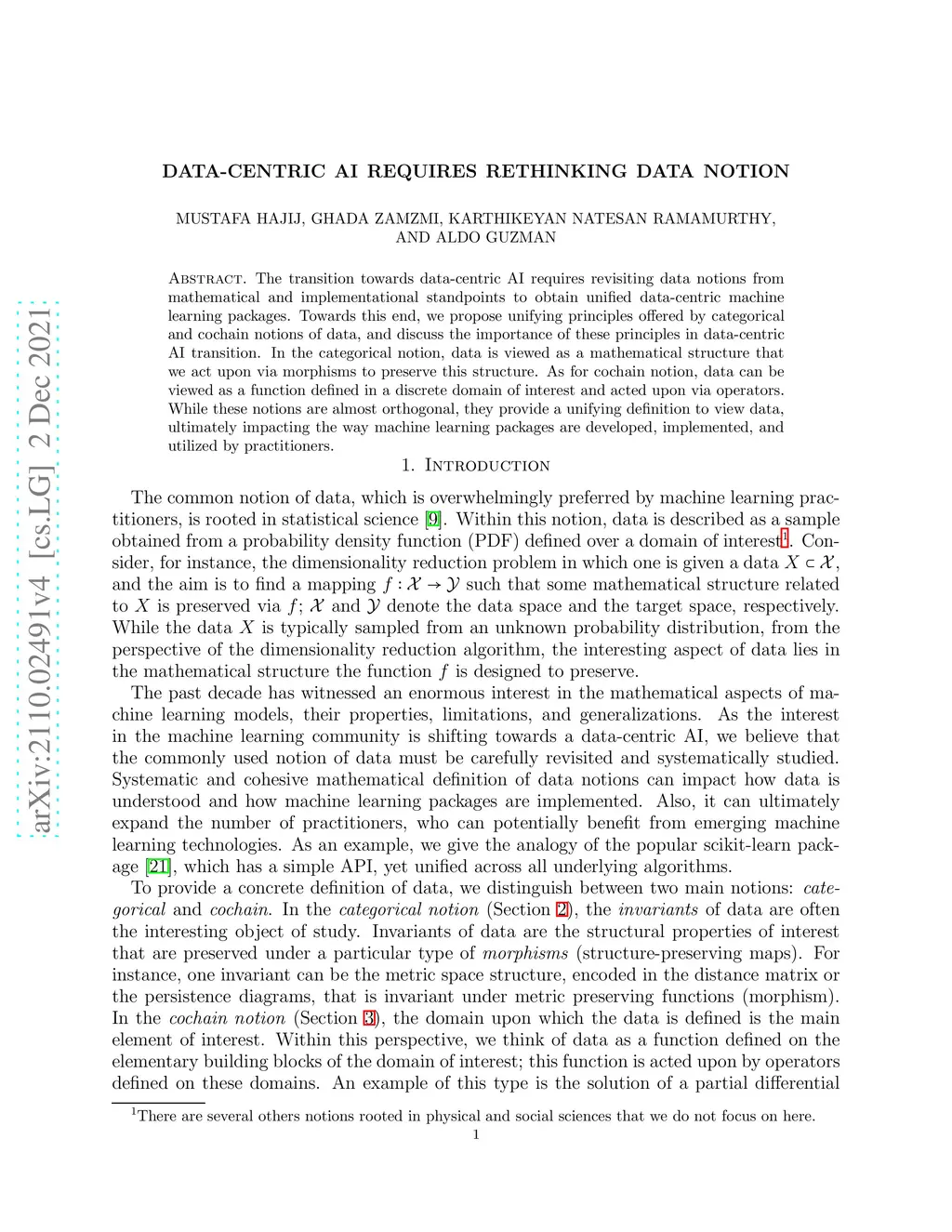 The transition towards data-centric AI requires revisiting data notions from mathematical and implementational standpoints to obtain unified data-centric machine learning packages. Towards this end, this work proposes unifying principles offered by categorical and cochain notions of data, and discusses the importance of these principles in data-centric AI transition. In the categorical notion, data is viewed as a mathematical structure that we act upon via morphisms to preserve this structure. As for cochain notion, data can be viewed as a function defined in a discrete domain of interest and acted upon via operators. While these notions are almost orthogonal, they provide a unifying definition to view data, ultimately impacting the way machine learning packages are developed, implemented, and utilized by practitioners.