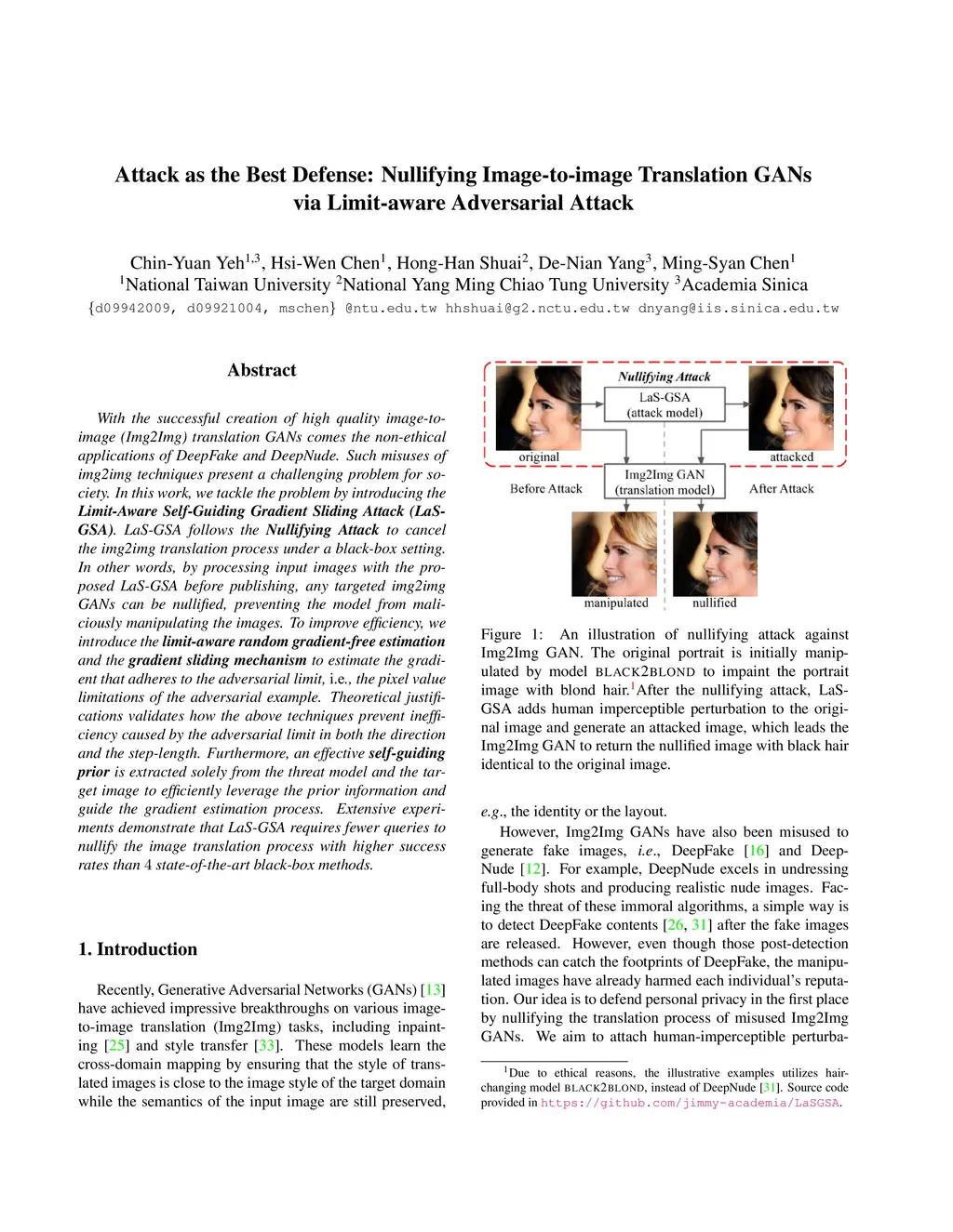 With the successful creation of high-quality image-to-image (Img2Img) translation GANs comes the non-ethical applications of DeepFake and DeepNude. Such misuses of img2img techniques present a challenging problem for society. In this work, we tackle the problem by introducing the Limit-Aware Self-Guiding Gradient Sliding Attack (LaS-GSA). LaS-GSA follows the Nullifying Attack to cancel the img2img translation process under a black-box setting. In other words, by processing input images with the proposed LaS-GSA before publishing, any targeted img2img GANs can be nullified, preventing the model from maliciously manipulating the images. To improve efficiency, we introduce the limit-aware random gradient-free estimation and the gradient sliding mechanism to estimate the gradient that adheres to the adversarial limit, i.e., the pixel value limitations of the adversarial example. Theoretical justifications validate how the above techniques prevent inefficiency caused by the adversarial limit in both the direction and the step length. Furthermore, an effective self-guiding prior is extracted solely from the threat model and the target image to efficiently leverage the prior information and guide the gradient estimation process. Extensive experiments demonstrate that LaS-GSA requires fewer queries to nullify the image translation process with higher success rates than 4 state-of-the-art black-box methods.