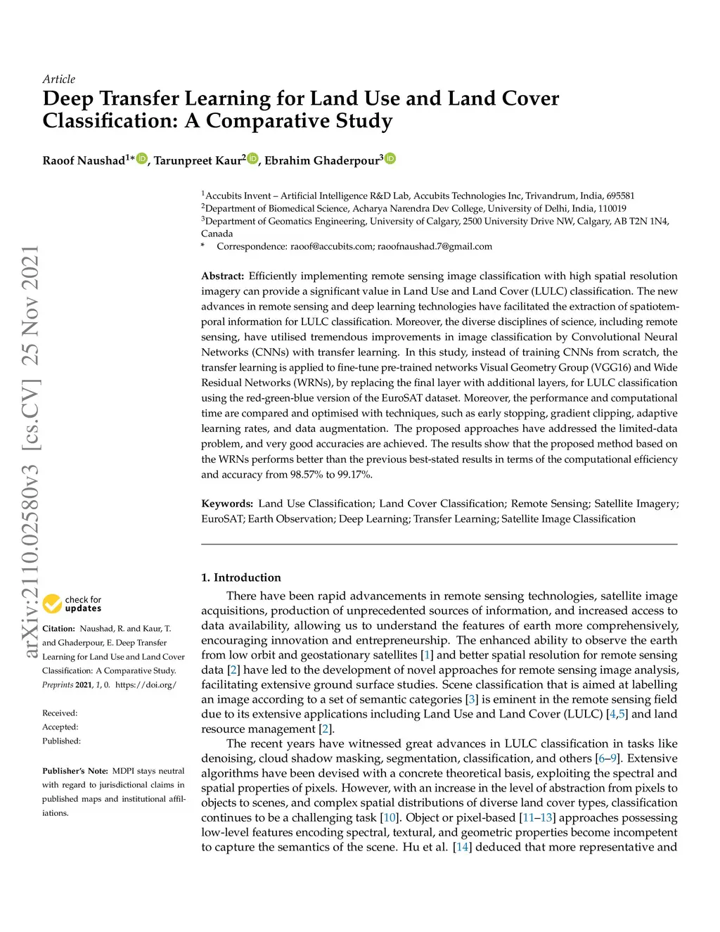 Efficiently implementing remote sensing image classification with high spatial resolution imagery can provide a significant value in Land Use and Land Cover (LULC) classification. The new advances in remote sensing and deep learning technologies have facilitated the extraction of spatiotemporal information for LULC classification. Moreover, the diverse disciplines of science, including remote sensing, have utilised tremendous improvements in image classification by Convolutional Neural Networks (CNNs) with transfer learning. In this study, instead of training CNNs from scratch, the transfer learning is applied to fine-tune pre-trained networks Visual Geometry Group (VGG16) and Wide Residual Networks (WRNs), by replacing the final layer with additional layers, for LULC classification using the red-green-blue version of the EuroSAT dataset. Moreover, the performance and computational time are compared and optimised with techniques, such as early stopping, gradient clipping, adaptive learning rates, and data augmentation. The proposed approaches have addressed the limited-data problem, and very good accuracies are achieved. The results show that the proposed method based on the WRNs performs better than the previous best-stated results in terms of the computational efficiency and accuracy from 98.57% to 99.17%.