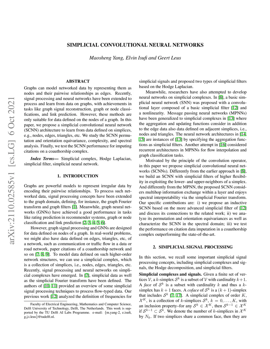 Graphs can model networked data by representing them as nodes and their pairwise relationships as edges. Recently, signal processing and neural networks have been extended to process and learn from data on graphs, with achievements in tasks like graph signal reconstruction, graph or node classifications, and link prediction. However, these methods are only suitable for data defined on the nodes of a graph. In this paper, we propose a simplicial convolutional neural network (SCNN) architecture to learn from data defined on simplices, e.g., nodes, edges, triangles, etc. We study the SCNN permutation and orientation equivariance, complexity, and spectral analysis. Finally, we test the SCNN performance for imputing citations on a coauthorship complex.