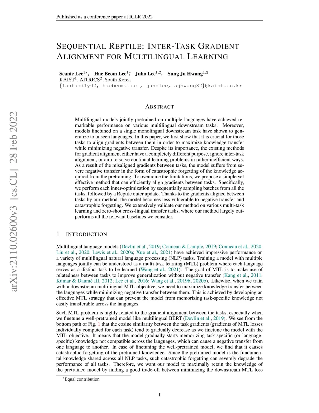 Sequential Reptile: Inter-Task Gradient Alignment for Multilingual