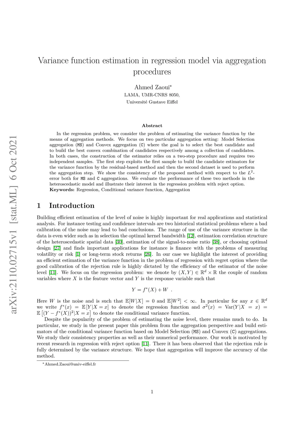 In the regression problem, we consider the problem of estimating the variance function by the means of aggregation methods. We focus on two particular aggregation setting: Model Selection aggregation (MS) and Convex aggregation (C) where the goal is to select the best candidate and to build the best convex combination of candidates respectively among a collection of candidates. In both cases, the construction of the estimator relies on a two-step procedure and requires two independent samples. The first step exploits the first sample to build the candidate estimators for the variance function by the residual-based method and then the second dataset is used to perform the aggregation step. We show the consistency of the proposed method with respect to the L 2error both for MS and C aggregations. We evaluate the performance of these two methods in the heteroscedastic model and illustrate their interest in the regression problem with reject option.