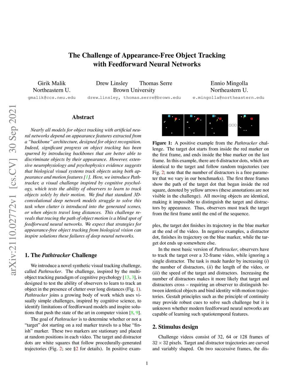 Nearly all models for object tracking with artificial neural networks depend on appearance features extracted from a "backbone" architecture, designed for object recognition. Indeed, significant progress on object tracking has been spurred by introducing backbones that are better able to discriminate objects by their appearance. However, extensive neurophysiology and psychophysics evidence suggests that biological visual systems track objects using both appearance and motion features. Here, we introduce , a visual challenge inspired by cognitive psychology, which tests the ability of observers to learn to track objects solely by their motion. We find that standard 3D-convolutional deep network models struggle to solve this task when clutter is introduced into the generated scenes, or when objects travel long distances. This challenge reveals that tracing the path of object motion is a blind spot of feedforward neural networks. We expect that strategies for appearance-free object tracking from biological vision can inspire solutions these failures of deep neural networks.