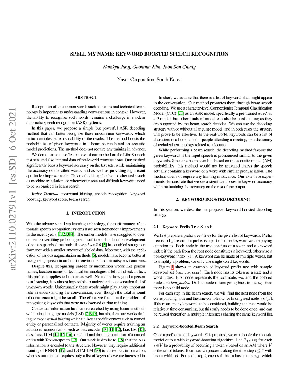Recognition of uncommon words such as names and technical terminology is important to understanding conversations in context. However, the ability to recognise such words remains a challenge in modern automatic speech recognition (ASR) systems. In this paper, we propose a simple but powerful ASR decoding method that can better recognise these uncommon keywords, which in turn enables better readability of the results. The method boosts the probabilities of given keywords in a beam search based on acoustic model predictions. The method does not require any training in advance. We demonstrate the effectiveness of our method on the LibriSpeeech test sets and also internal data of real-world conversations. Our method significantly boosts keyword accuracy on the test sets, while maintaining the accuracy of the other words, and as well as providing significant qualitative improvements. This method is applicable to other tasks such as machine translation, or wherever unseen and difficult keywords need to be recognised in beam search.
