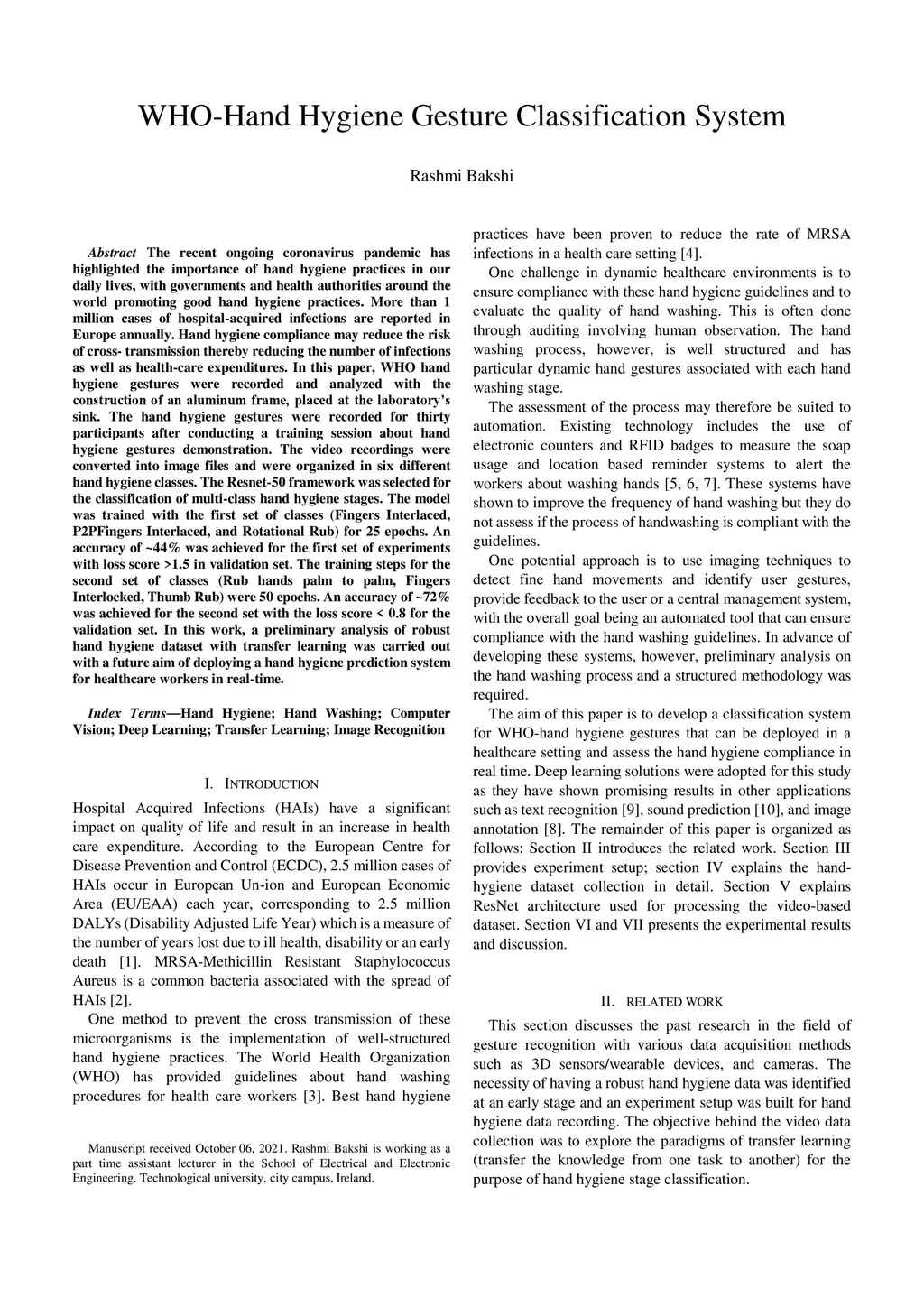 The recent ongoing coronavirus pandemic highlights the importance of hand hygiene practices in our daily lives, with governments and worldwide health authorities promoting good hand hygiene practices. More than one million cases of hospital-acquired infections occur in Europe annually. Hand hygiene compliance may reduce the risk of transmission by reducing the number of infections as well as healthcare expenditures. In this paper, the World Health Organization, hand hygiene gestures are recorded and analyzed with the construction of an aluminum frame, placed at the laboratory sink. The hand hygiene gestures are recorded for thirty participants after conducting a training session about hand hygiene gestures demonstration. The video recordings are converted into image files and are organized into six different hand hygiene classes. The Resnet50 framework selection for the classification of multiclass hand hygiene stages. The model is trained with the first set of classes; Fingers Interlaced, P2PFingers Interlaced, and Rotational Rub for 25 epochs. An accuracy of 44 percent for the first set of experiments with a loss score greater than 1.5 in the validation set is achieved. The training steps for the second set of classes; Rub hands palm to palm, Fingers Interlocked, Thumb Rub are 50 epochs. An accuracy of 72 percent is achieved for the second set with a loss score of less than 0.8 for the validation set. In this work, a preliminary analysis of a robust hand hygiene dataset with transfer learning takes place. The future aim for deploying a hand hygiene prediction system for healthcare workers in real-time.