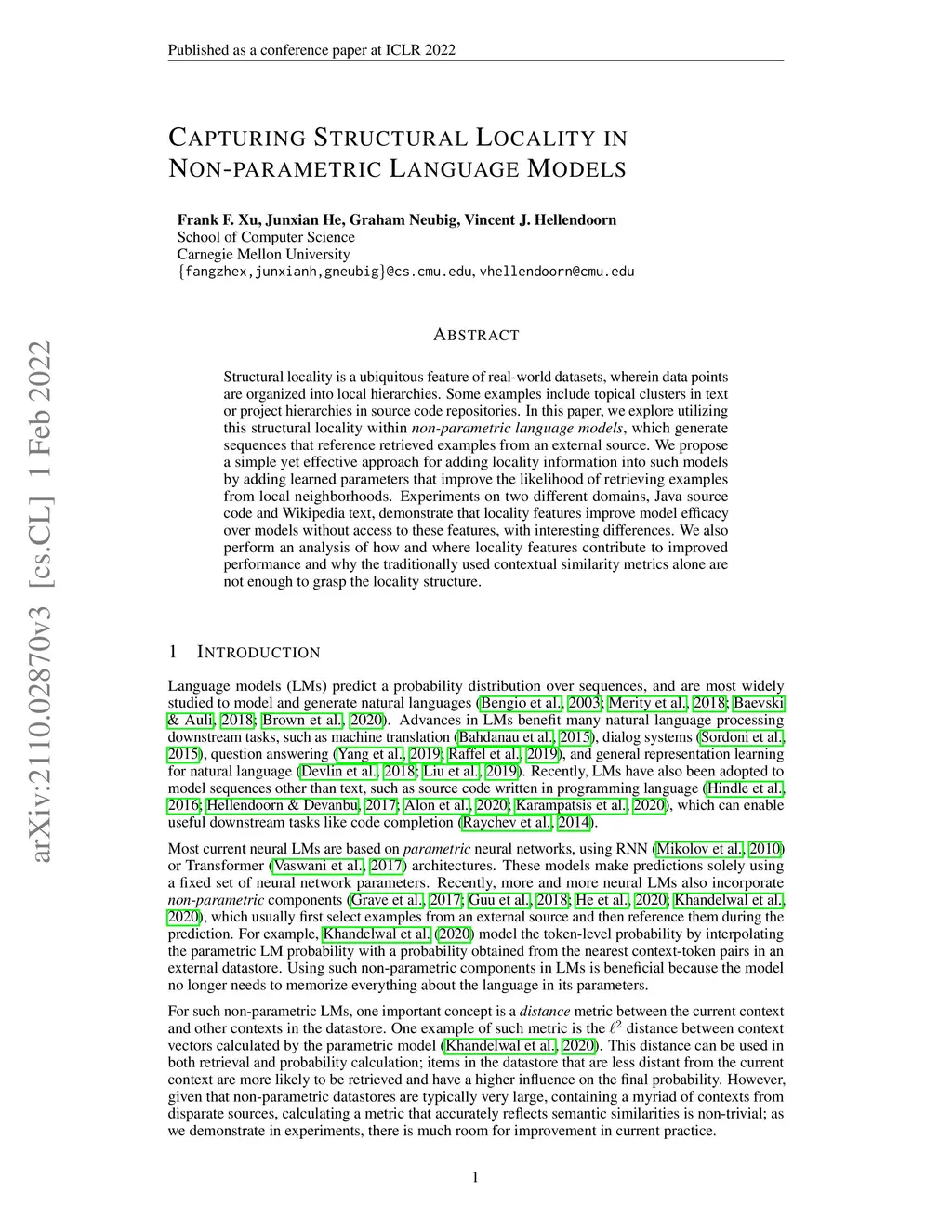 Structural locality is a ubiquitous feature of real-world datasets, wherein data points are organized into local hierarchies. Some examples include topical clusters in text or project hierarchies in source code repositories. In this paper, we explore utilizing this structural locality within non-parametric language models, which generate sequences that reference retrieved examples from an external source. We propose a simple yet effective approach for adding locality information into such models by adding learned parameters that improve the likelihood of retrieving examples from local neighborhoods. Experiments on two different domains, Java source code and Wikipedia text, demonstrate that locality features improve model efficacy over models without access to these features, with interesting differences. We also perform an analysis of how and where locality features contribute to improved performance and why the traditionally used contextual similarity metrics alone are not enough to grasp the locality structure.