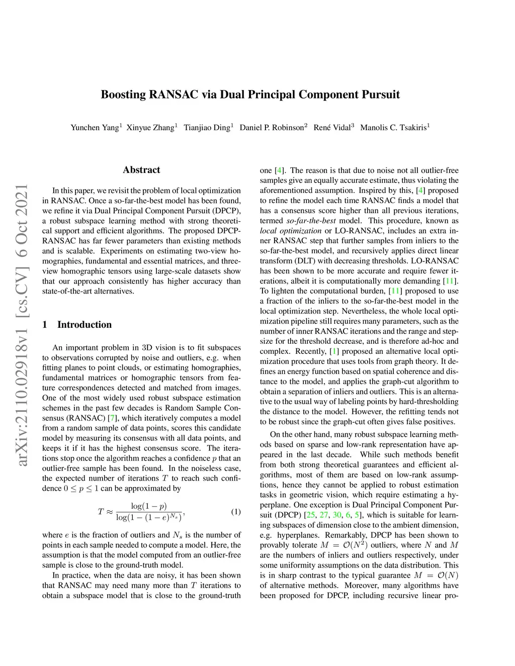 In this paper, we revisit the problem of local optimization in RANSAC. Once a so-far-the-best model has been found, we refine it via Dual Principal Component Pursuit (DPCP), a robust subspace learning method with strong theoretical support and efficient algorithms. The proposed DPCP-RANSAC has far fewer parameters than existing methods and is scalable. Experiments on estimating two-view homographies, fundamental and essential matrices, and three-view homographic tensors using large-scale datasets show that our approach consistently has higher accuracy than state-of-the-art alternatives.