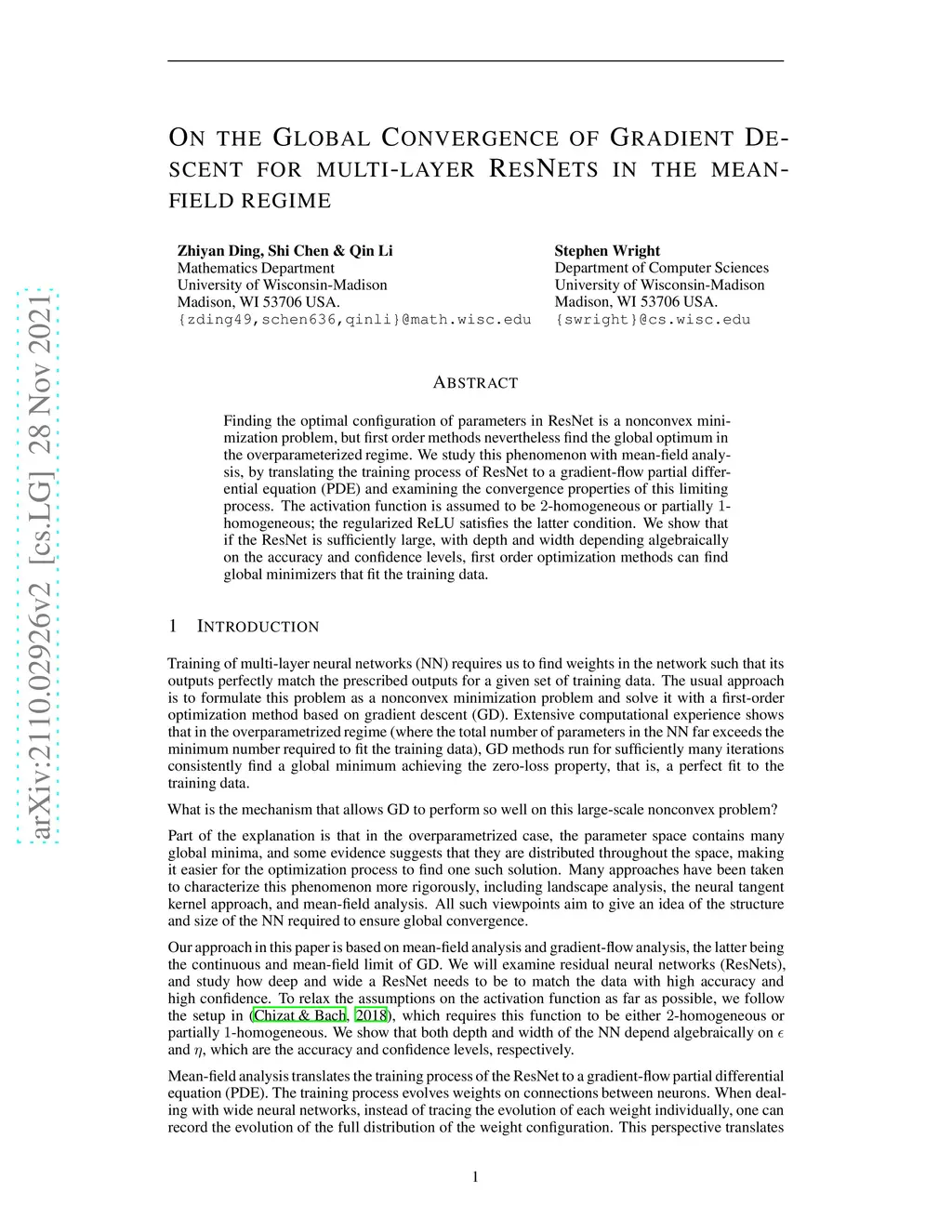 Finding the optimal configuration of parameters in ResNet is a nonconvex minimization problem, but first-order methods nevertheless find the global optimum in the overparameterized regime. We study this phenomenon with mean-field analysis, by translating the training process of ResNet to a gradient-flow partial differential equation (PDE) and examining the convergence properties of this limiting process. The activation function is assumed to be -homogeneous or partially -homogeneous; the regularized ReLU satisfies the latter condition. We show that if the ResNet is sufficiently large, with depth and width depending algebraically on the accuracy and confidence levels, first-order optimization methods can find global minimizers that fit the training data.