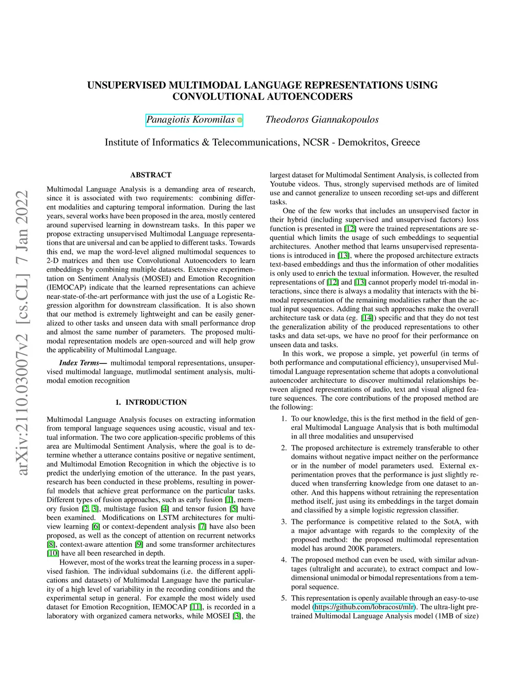 Unsupervised Multimodal Language Representations using Convolutional