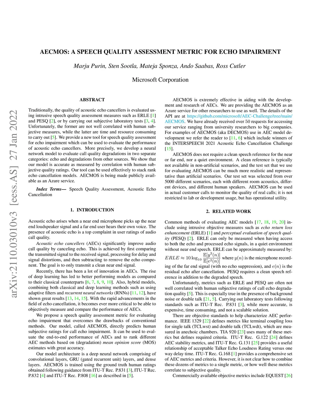 Traditionally, the quality of acoustic echo cancellers is evaluated using intrusive speech quality assessment measures such as ERLE \cite{g168} and PESQ \cite{p862}, or by carrying out subjective laboratory tests. Unfortunately, the former are not well correlated with human subjective measures, while the latter are time and resource consuming to carry out. We provide a new tool for speech quality assessment for echo impairment which can be used to evaluate the performance of acoustic echo cancellers. More precisely, we develop a neural network model to evaluate call quality degradations in two separate categories: echo and degradations from other sources. We show that our model is accurate as measured by correlation with human subjective quality ratings. Our tool can be used effectively to stack rank echo cancellation models. AECMOS is being made publicly available as an Azure service.