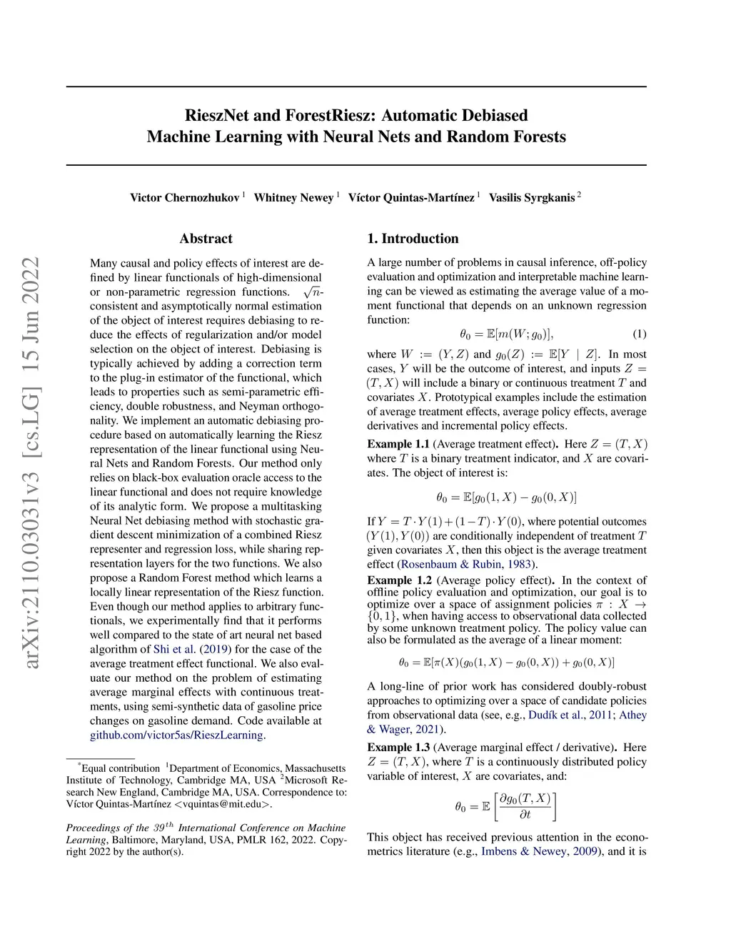 Many causal and policy effects of interest are defined by linear functionals of high-dimensional or non-parametric regression functions. -consistent and asymptotically normal estimation of the object of interest requires debiasing to reduce the effects of regularization and/or model selection on the object of interest. Debiasing is typically achieved by adding a correction term to the plug-in estimator of the functional, which leads to properties such as semi-parametric efficiency, double robustness, and Neyman orthogonality. We implement an automatic debiasing procedure based on automatically learning the Riesz representation of the linear functional using Neural Nets and Random Forests. Our method only relies on black-box evaluation oracle access to the linear functional and does not require knowledge of its analytic form. We propose a multitasking Neural Net debiasing method with stochastic gradient descent minimization of a combined Riesz representer and regression loss, while sharing representation layers for the two functions. We also propose a Random Forest method which learns a locally linear representation of the Riesz function. Even though our method applies to arbitrary functionals, we experimentally find that it performs well compared to the state of art neural net based algorithm of Shi et al. (2019) for the case of the average treatment effect functional. We also evaluate our method on the problem of estimating average marginal effects with continuous treatments, using semi-synthetic data of gasoline price changes on gasoline demand.