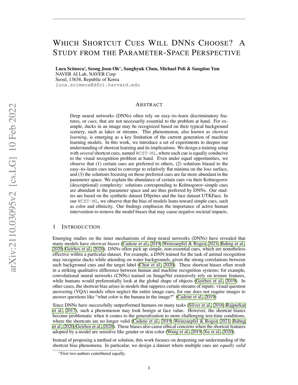 Deep neural networks (DNNs) often rely on easy-to-learn discriminatory features, or cues, that are not necessarily essential to the problem at hand. For example, ducks in an image may be recognized based on their typical background scenery, such as lakes or streams. This phenomenon, also known as shortcut learning, is emerging as a key limitation of the current generation of machine learning models. In this work, we introduce a set of experiments to deepen our understanding of shortcut learning and its implications. We design a training setup with several shortcut cues, named WCST-ML, where each cue is equally conducive to the visual recognition problem at hand. Even under equal opportunities, we observe that (1) certain cues are preferred to others, (2) solutions biased to the easy-to-learn cues tend to converge to relatively flat minima on the loss surface, and (3) the solutions focusing on those preferred cues are far more abundant in the parameter space. We explain the abundance of certain cues via their Kolmogorov (descriptional) complexity: solutions corresponding to Kolmogorov-simple cues are abundant in the parameter space and are thus preferred by DNNs. Our studies are based on the synthetic dataset DSprites and the face dataset UTKFace. In our WCST-ML, we observe that the inborn bias of models leans toward simple cues, such as color and ethnicity. Our findings emphasize the importance of active human intervention to remove the inborn model biases that may cause negative societal impacts.
