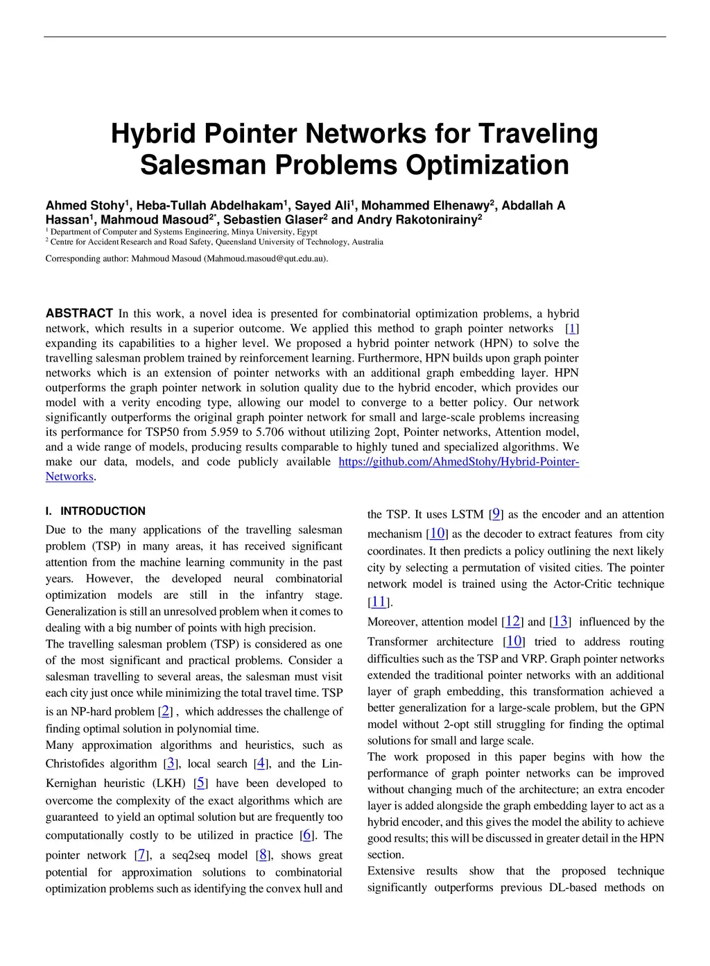 In this work, a novel idea is presented for combinatorial optimization problems, a hybrid network, which results in a superior outcome. We applied this method to graph pointer networks [1], expanding its capabilities to a higher level. We proposed a hybrid pointer network (HPN) to solve the travelling salesman problem trained by reinforcement learning. Furthermore, HPN builds upon graph pointer networks which is an extension of pointer networks with an additional graph embedding layer. HPN outperforms the graph pointer network in solution quality due to the hybrid encoder, which provides our model with a verity encoding type, allowing our model to converge to a better policy. Our network significantly outperforms the original graph pointer network for small and large-scale problems increasing its performance for TSP50 from 5.959 to 5.706 without utilizing 2opt, Pointer networks, Attention model, and a wide range of models, producing results comparable to highly tuned and specialized algorithms. We make our data, models, and code publicly available [2].