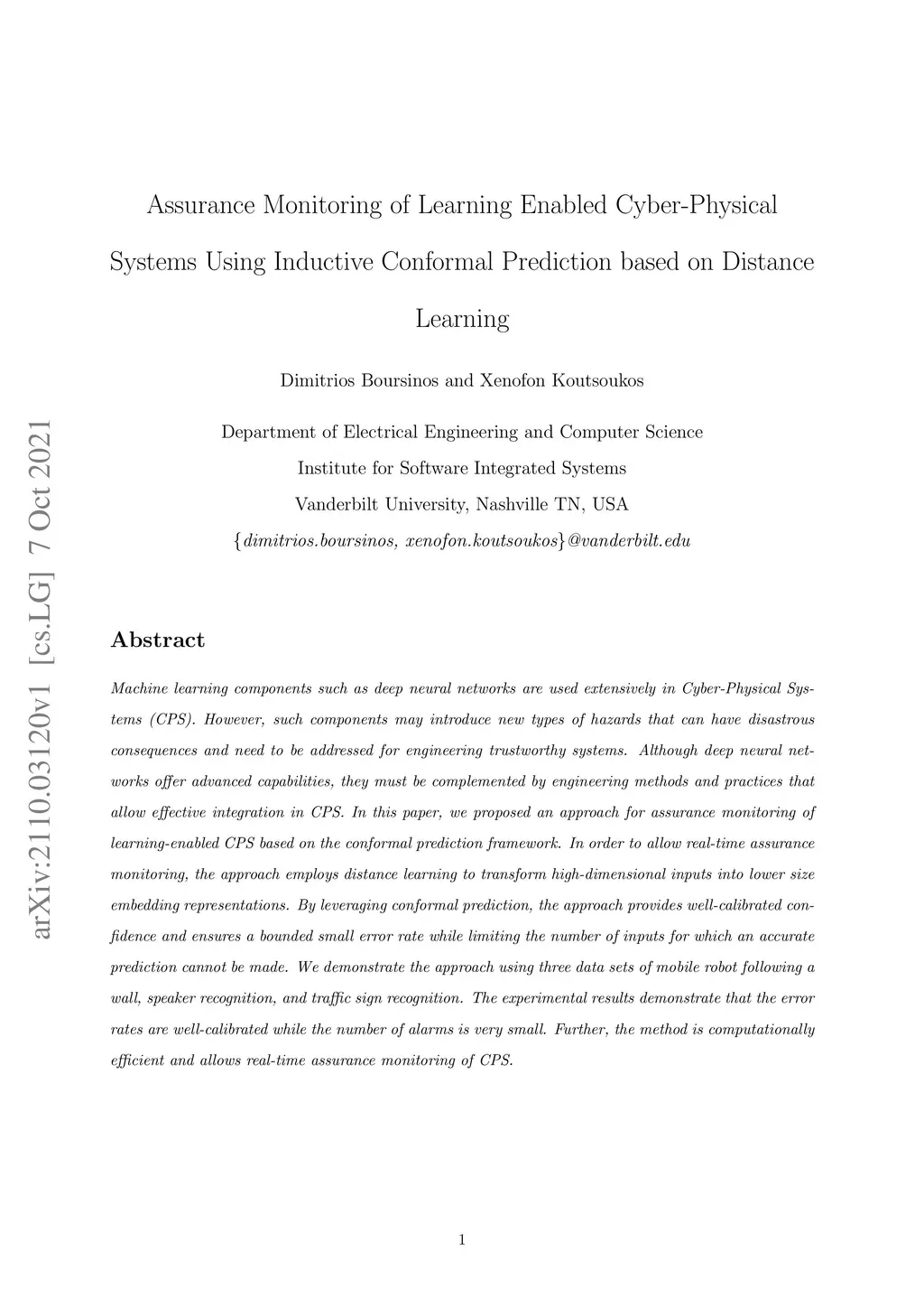 Machine learning components such as deep neural networks are used extensively in Cyber-Physical Systems (CPS). However, such components may introduce new types of hazards that can have disastrous consequences and need to be addressed for engineering trustworthy systems. Although deep neural networks offer advanced capabilities, they must be complemented by engineering methods and practices that allow effective integration in CPS. In this paper, we proposed an approach for assurance monitoring of learning-enabled CPS based on the conformal prediction framework. In order to allow real-time assurance monitoring, the approach employs distance learning to transform high-dimensional inputs into lower size embedding representations. By leveraging conformal prediction, the approach provides well-calibrated confidence and ensures a bounded small error rate while limiting the number of inputs for which an accurate prediction cannot be made. We demonstrate the approach using three data sets of mobile robot following a wall, speaker recognition, and traffic sign recognition. The experimental results demonstrate that the error rates are well-calibrated while the number of alarms is very small. Further, the method is computationally efficient and allows real-time assurance monitoring of CPS.