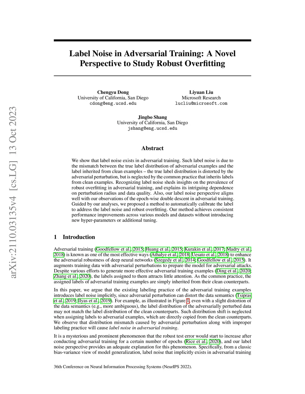 We show that label noise exists in adversarial training. Such label noise is due to the mismatch between the true label distribution of adversarial examples and the label inherited from clean examples - the true label distribution is distorted by the adversarial perturbation, but is neglected by the common practice that inherits labels from clean examples. Recognizing label noise sheds insights on the prevalence of robust overfitting in adversarial training, and explains its intriguing dependence on perturbation radius and data quality. Also, our label noise perspective aligns well with our observations of the epoch-wise double descent in adversarial training. Guided by our analyses, we proposed a method to automatically calibrate the label to address the label noise and robust overfitting. Our method achieves consistent performance improvements across various models and datasets without introducing new hyper-parameters or additional tuning.