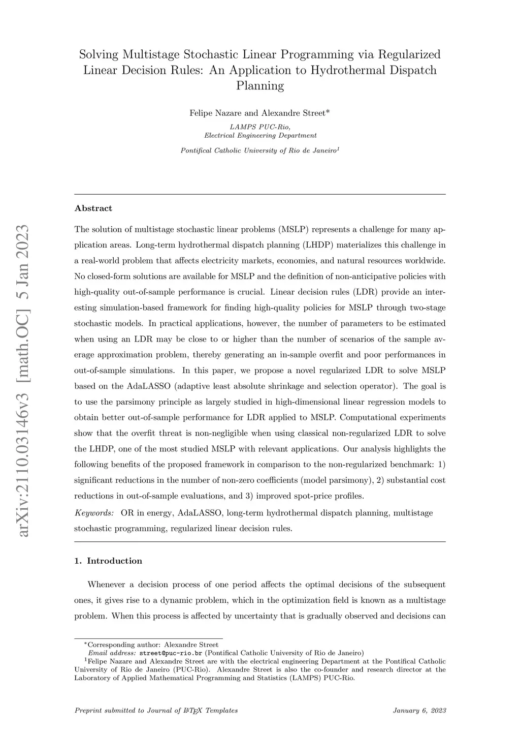 The solution of multistage stochastic linear problems (MSLP) represents a challenge for many application areas. Long-term hydrothermal dispatch planning (LHDP) materializes this challenge in a real-world problem that affects electricity markets, economies, and natural resources worldwide. No closed-form solutions are available for MSLP and the definition of non-anticipative policies with high-quality out-of-sample performance is crucial. Linear decision rules (LDR) provide an interesting simulation-based framework for finding high-quality policies for MSLP through two-stage stochastic models. In practical applications, however, the number of parameters to be estimated when using an LDR may be close to or higher than the number of scenarios of the sample average approximation problem, thereby generating an in-sample overfit and poor performances in out-of-sample simulations. In this paper, we propose a novel regularized LDR to solve MSLP based on the AdaLASSO (adaptive least absolute shrinkage and selection operator). The goal is to use the parsimony principle, as largely studied in high-dimensional linear regression models, to obtain better out-of-sample performance for LDR applied to MSLP. Computational experiments show that the overfit threat is non-negligible when using classical non-regularized LDR to solve the LHDP, one of the most studied MSLP with relevant applications. Our analysis highlights the following benefits of the proposed framework in comparison to the non-regularized benchmark: 1) significant reductions in the number of non-zero coefficients (model parsimony), 2) substantial cost reductions in out-of-sample evaluations, and 3) improved spot-price profiles.