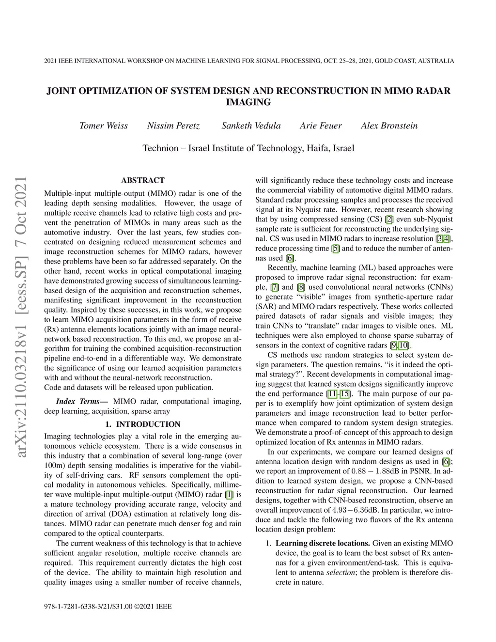 Multiple-input multiple-output (MIMO) radar is one of the leading depth sensing modalities. However, the usage of multiple receive channels lead to relative high costs and prevent the penetration of MIMOs in many areas such as the automotive industry. Over the last years, few studies concentrated on designing reduced measurement schemes and image reconstruction schemes for MIMO radars, however these problems have been so far addressed separately. On the other hand, recent works in optical computational imaging have demonstrated growing success of simultaneous learning-based design of the acquisition and reconstruction schemes, manifesting significant improvement in the reconstruction quality. Inspired by these successes, in this work, we propose to learn MIMO acquisition parameters in the form of receive (Rx) antenna elements locations jointly with an image neural-network based reconstruction. To this end, we propose an algorithm for training the combined acquisition-reconstruction pipeline end-to-end in a differentiable way. We demonstrate the significance of using our learned acquisition parameters with and without the neural-network reconstruction.
