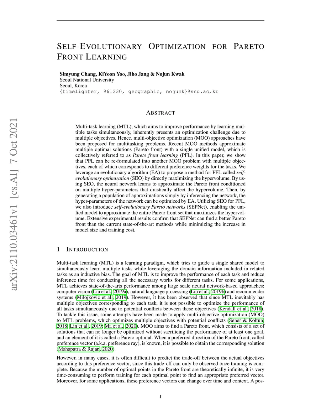 Multi-task learning (MTL), which aims to improve performance by learning multiple tasks simultaneously, inherently presents an optimization challenge due to multiple objectives. Hence, multi-objective optimization (MOO) approaches have been proposed for multitasking problems. Recent MOO methods approximate multiple optimal solutions (Pareto front) with a single unified model, which is collectively referred to as Pareto front learning (PFL). In this paper, we show that PFL can be re-formulated into another MOO problem with multiple objectives, each of which corresponds to different preference weights for the tasks. We leverage an evolutionary algorithm (EA) to propose a method for PFL called self-evolutionary optimization (SEO) by directly maximizing the hypervolume. By using SEO, the neural network learns to approximate the Pareto front conditioned on multiple hyper-parameters that drastically affect the hypervolume. Then, by generating a population of approximations simply by inferencing the network, the hyper-parameters of the network can be optimized by EA. Utilizing SEO for PFL, we also introduce self-evolutionary Pareto networks (SEPNet), enabling the unified model to approximate the entire Pareto front set that maximizes the hypervolume. Extensive experimental results confirm that SEPNet can find a better Pareto front than the current state-of-the-art methods while minimizing the increase in model size and training cost.