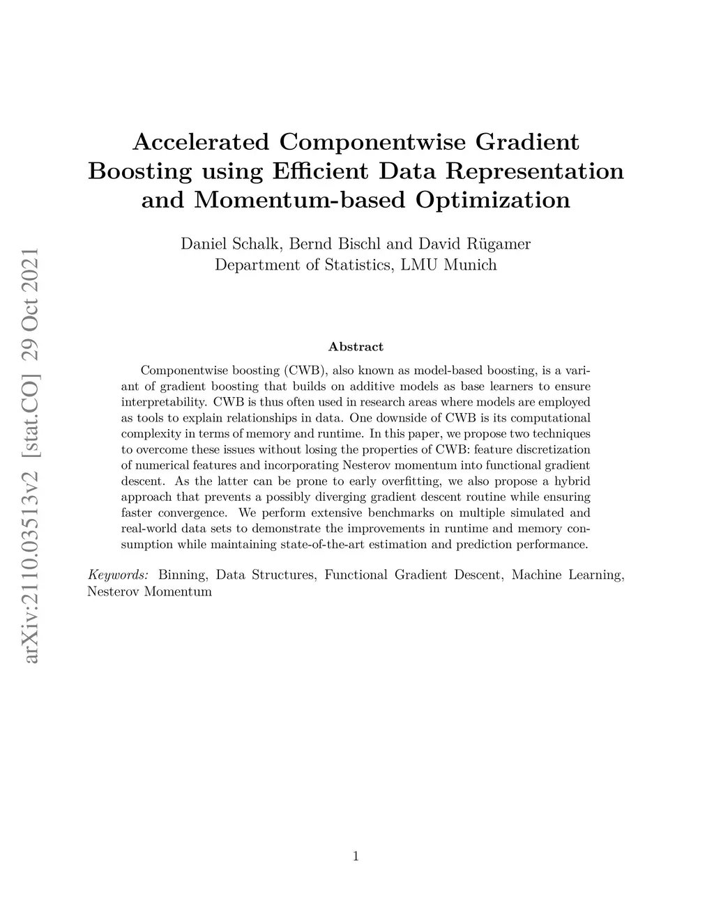 Componentwise boosting (CWB), also known as model-based boosting, is a variant of gradient boosting that builds on additive models as base learners to ensure interpretability. CWB is thus often used in research areas where models are employed as tools to explain relationships in data. One downside of CWB is its computational complexity in terms of memory and runtime. In this paper, we propose two techniques to overcome these issues without losing the properties of CWB: feature discretization of numerical features and incorporating Nesterov momentum into functional gradient descent. As the latter can be prone to early overfitting, we also propose a hybrid approach that prevents a possibly diverging gradient descent routine while ensuring faster convergence. We perform extensive benchmarks on multiple simulated and real-world data sets to demonstrate the improvements in runtime and memory consumption while maintaining state-of-the-art estimation and prediction performance.