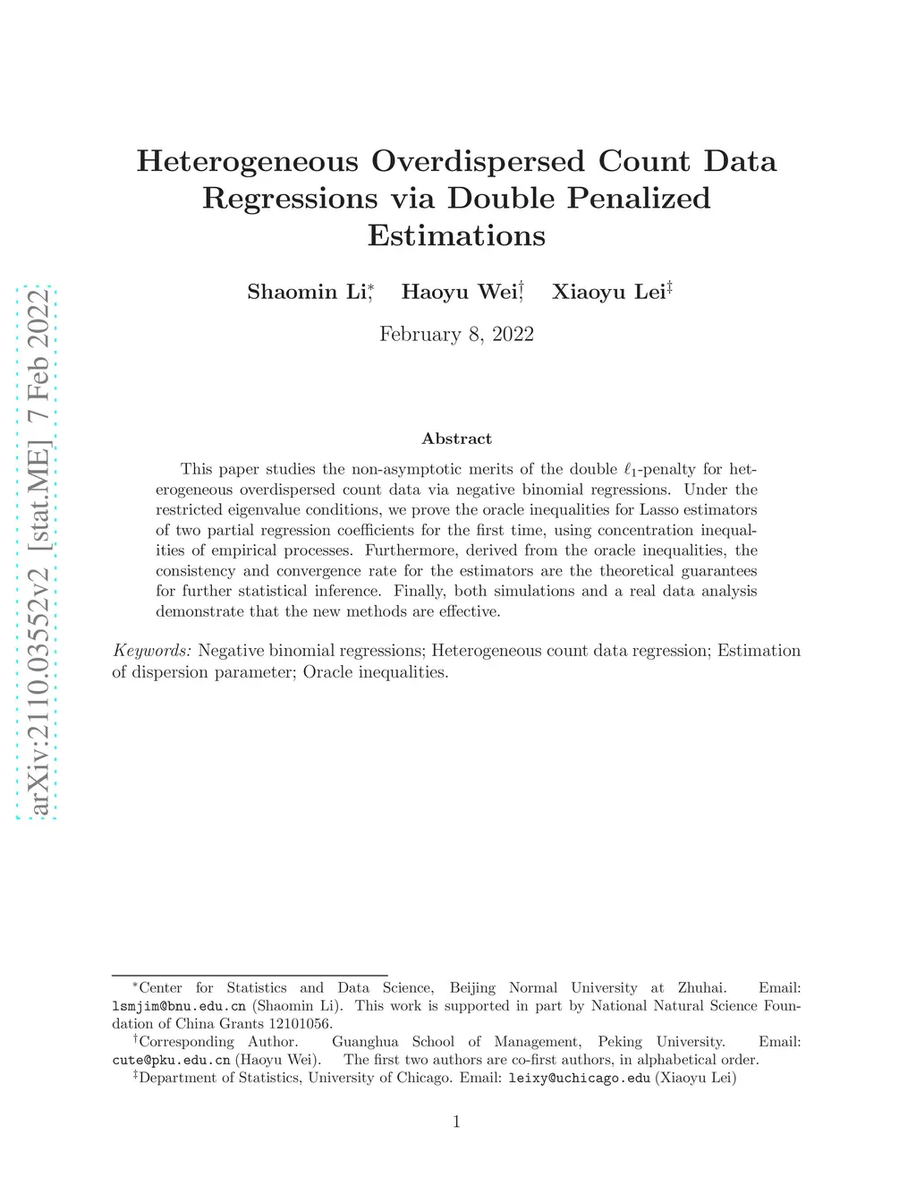 This paper studies the non-asymptotic merits of the double -regularized for heterogeneous overdispersed count data via negative binomial regressions. Under the restricted eigenvalue conditions, we prove the oracle inequalities for Lasso estimators of two partial regression coefficients for the first time, using concentration inequalities of empirical processes. Furthermore, derived from the oracle inequalities, the consistency and convergence rate for the estimators are the theoretical guarantees for further statistical inference. Finally, both simulations and a real data analysis demonstrate that the new methods are effective.