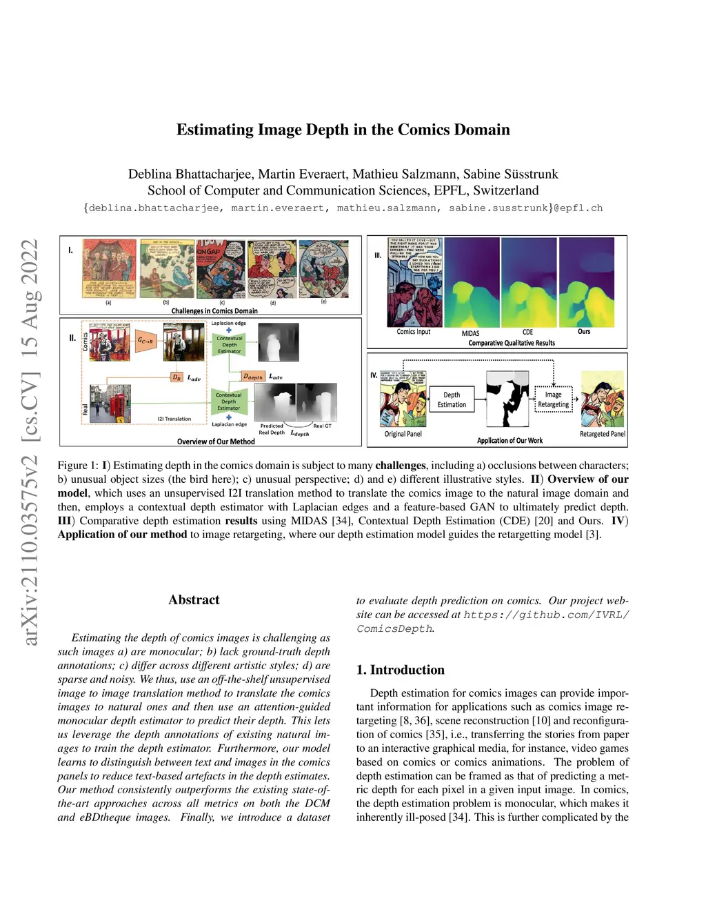 Estimating the depth of comics images is challenging as such images a) are monocular; b) lack ground-truth depth annotations; c) differ across different artistic styles; d) are sparse and noisy. We thus, use an off-the-shelf unsupervised image to image translation method to translate the comics images to natural ones and then use an attention-guided monocular depth estimator to predict their depth. This lets us leverage the depth annotations of existing natural images to train the depth estimator. Furthermore, our model learns to distinguish between text and images in the comics panels to reduce text-based artefacts in the depth estimates. Our method consistently outperforms the existing state-ofthe-art approaches across all metrics on both the DCM and eBDtheque images. Finally, we introduce a dataset to evaluate depth prediction on comics. Our project website can be accessed at https://github.com/IVRL/ComicsDepth.