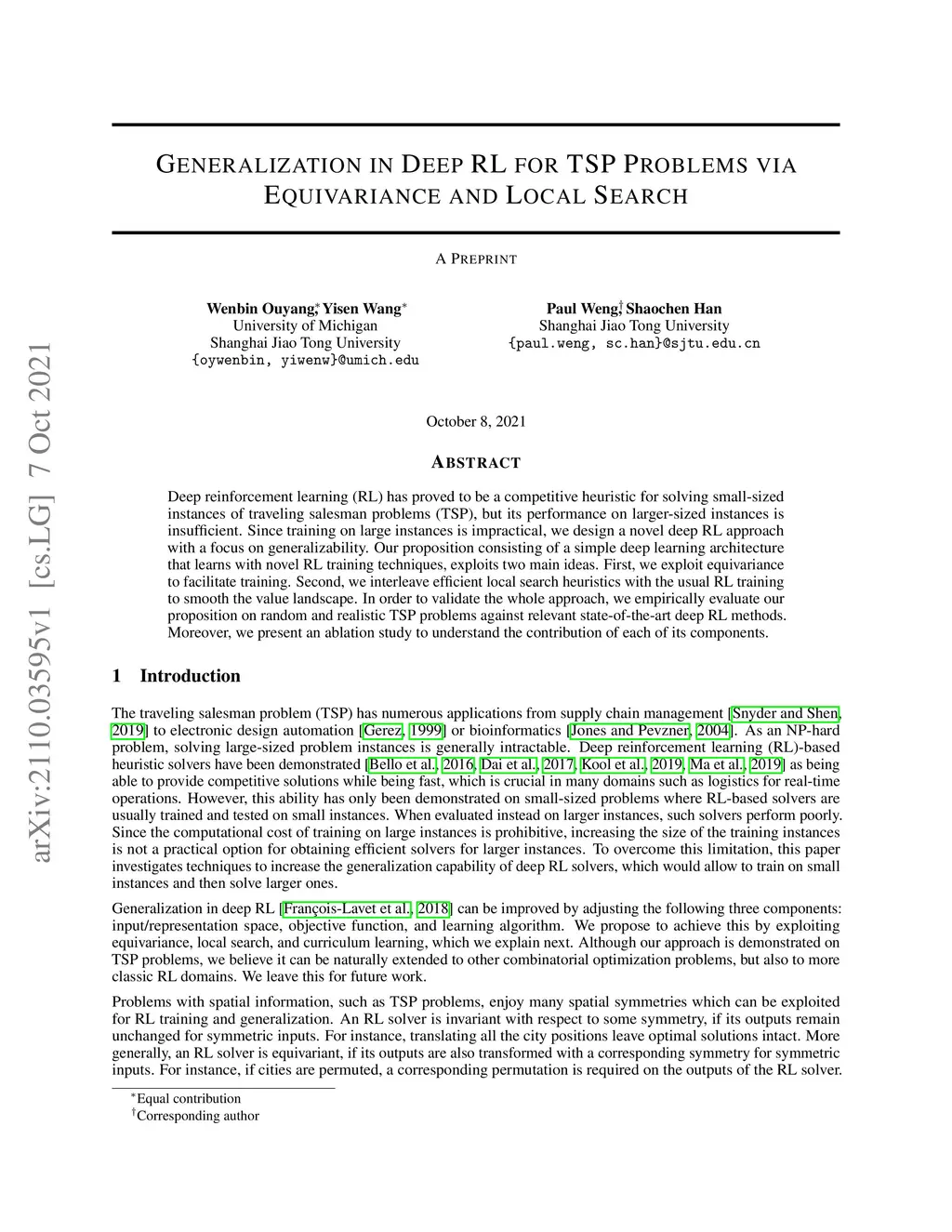 Deep reinforcement learning (RL) has proved to be a competitive heuristic for solving small-sized instances of traveling salesman problems (TSP), but its performance on larger-sized instances is insufficient. Since training on large instances is impractical, we design a novel deep RL approach with a focus on generalizability. Our proposition consisting of a simple deep learning architecture that learns with novel RL training techniques, exploits two main ideas. First, we exploit equivariance to facilitate training. Second, we interleave efficient local search heuristics with the usual RL training to smooth the value landscape. In order to validate the whole approach, we empirically evaluate our proposition on random and realistic TSP problems against relevant state-of-the-art deep RL methods. Moreover, we present an ablation study to understand the contribution of each of its component