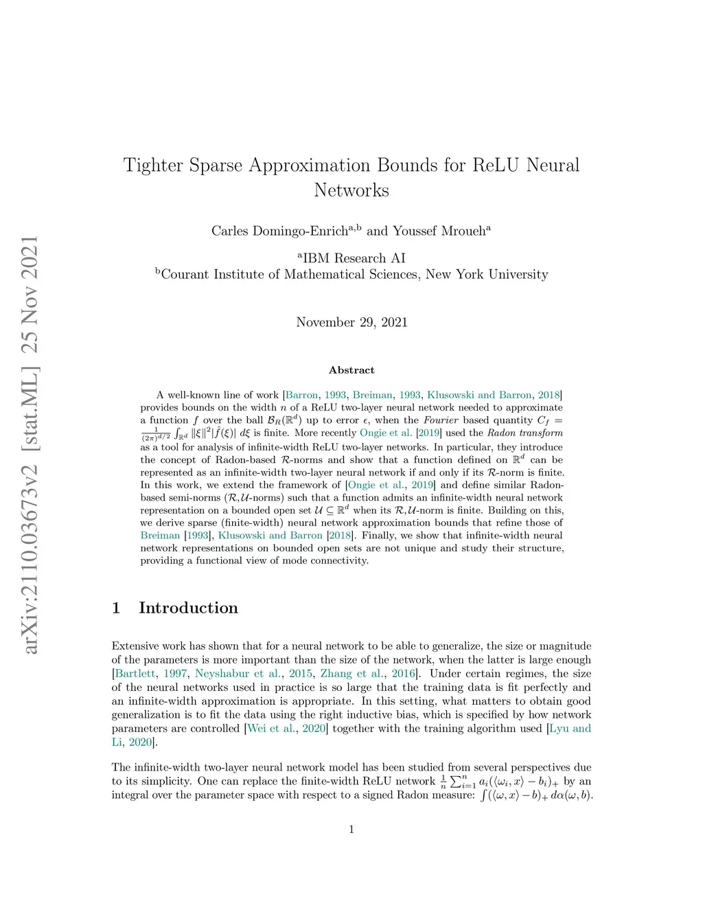 A well-known line of work (Barron, 1993; Breiman, 1993; Klusowski & Barron, 2018) provides bounds on the width of a ReLU two-layer neural network needed to approximate a function over the ball up to error , when the Fourier based quantity is finite. More recently Ongie et al. (2019) used the Radon transform as a tool for analysis of infinite-width ReLU two-layer networks. In particular, they introduce the concept of Radon-based -norms and show that a function defined on can be represented as an infinite-width two-layer neural network if and only if its -norm is finite. In this work, we extend the framework of Ongie et al. (2019) and define similar Radon-based semi-norms (-norms) such that a function admits an infinite-width neural network representation on a bounded open set when its -norm is finite. Building on this, we derive sparse (finite-width) neural network approximation bounds that refine those of Breiman (1993); Klusowski & Barron (2018). Finally, we show that infinite-width neural network representations on bounded open sets are not unique and study their structure, providing a functional view of mode connectivity.