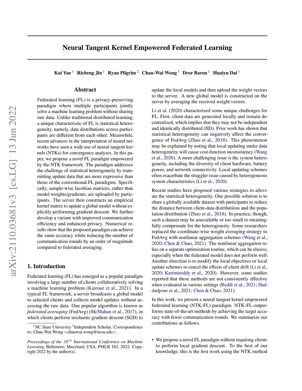 Federated learning (FL) is a privacy-preserving paradigm where multiple participants jointly solve a machine learning problem without sharing raw data. Unlike traditional distributed learning, a unique characteristic of FL is statistical heterogeneity, namely, data distributions across participants are different from each other. Meanwhile, recent advances in the interpretation of neural networks have seen a wide use of neural tangent kernels (NTKs) for convergence analyses. In this paper, we propose a novel FL paradigm empowered by the NTK framework. The paradigm addresses the challenge of statistical heterogeneity by transmitting update data that are more expressive than those of the conventional FL paradigms. Specifically, sample-wise Jacobian matrices, rather than model weights/gradients, are uploaded by participants. The server then constructs an empirical kernel matrix to update a global model without explicitly performing gradient descent. We further develop a variant with improved communication efficiency and enhanced privacy. Numerical results show that the proposed paradigm can achieve the same accuracy while reducing the number of communication rounds by an order of magnitude compared to federated averaging.