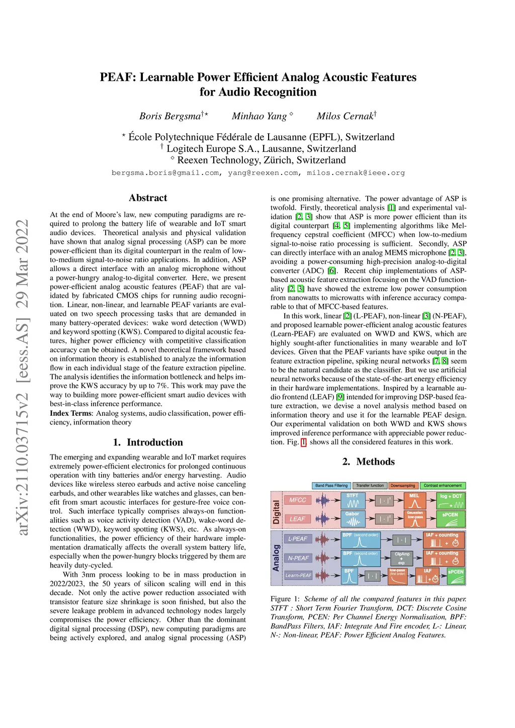 At the end of Moore's law, new computing paradigms are required to prolong the battery life of wearable and IoT smart audio devices. Theoretical analysis and physical validation have shown that analog signal processing (ASP) can be more power-efficient than its digital counterpart in the realm of low-to-medium signal-to-noise ratio applications. In addition, ASP allows a direct interface with an analog microphone without a power-hungry analog-to-digital converter. Here, we present power-efficient analog acoustic features (PEAF) that are validated by fabricated CMOS chips for running audio recognition. Linear, non-linear, and learnable PEAF variants are evaluated on two speech processing tasks that are demanded in many battery-operated devices: wake word detection (WWD) and keyword spotting (KWS). Compared to digital acoustic features, higher power efficiency with competitive classification accuracy can be obtained. A novel theoretical framework based on information theory is established to analyze the information flow in each individual stage of the feature extraction pipeline. The analysis identifies the information bottleneck and helps improve the KWS accuracy by up to 7%. This work may pave the way to building more power-efficient smart audio devices with best-in-class inference performance.