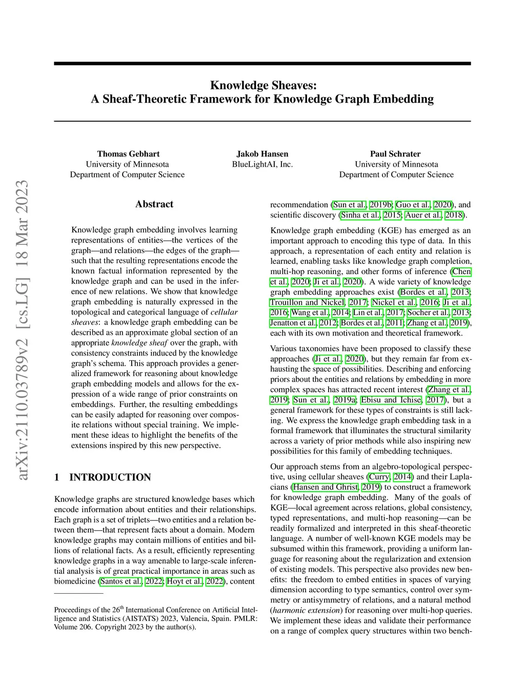 Knowledge graph embedding involves learning representations of entities -- the vertices of the graph -- and relations -- the edges of the graph -- such that the resulting representations encode the known factual information represented by the knowledge graph and can be used in the inference of new relations. We show that knowledge graph embedding is naturally expressed in the topological and categorical language of \textit{cellular sheaves}: a knowledge graph embedding can be described as an approximate global section of an appropriate \textit{knowledge sheaf} over the graph, with consistency constraints induced by the knowledge graph's schema. This approach provides a generalized framework for reasoning about knowledge graph embedding models and allows for the expression of a wide range of prior constraints on embeddings. Further, the resulting embeddings can be easily adapted for reasoning over composite relations without special training. We implement these ideas to highlight the benefits of the extensions inspired by this new perspective.