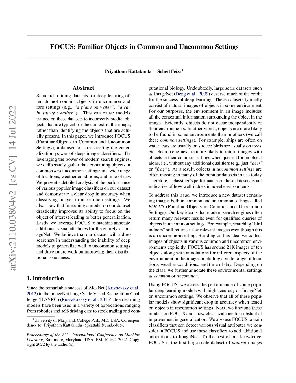 Standard training datasets for deep learning often contain objects in common settings (e.g., "a horse on grass" or "a ship in water") since they are usually collected by randomly scraping the web. Uncommon and rare settings (e.g., "a plane on water", "a car in snowy weather") are thus severely under-represented in the training data. This can lead to an undesirable bias in model predictions towards common settings and create a false sense of accuracy. In this paper, we introduce FOCUS (Familiar Objects in Common and Uncommon Settings), a dataset for stress-testing the generalization power of deep image classifiers. By leveraging the power of modern search engines, we deliberately gather data containing objects in common and uncommon settings in a wide range of locations, weather conditions, and time of day. We present a detailed analysis of the performance of various popular image classifiers on our dataset and demonstrate a clear drop in performance when classifying images in uncommon settings. By analyzing deep features of these models, we show that such errors can be due to the use of spurious features in model predictions. We believe that our dataset will aid researchers in understanding the inability of deep models to generalize well to uncommon settings and drive future work on improving their distributional robustness.