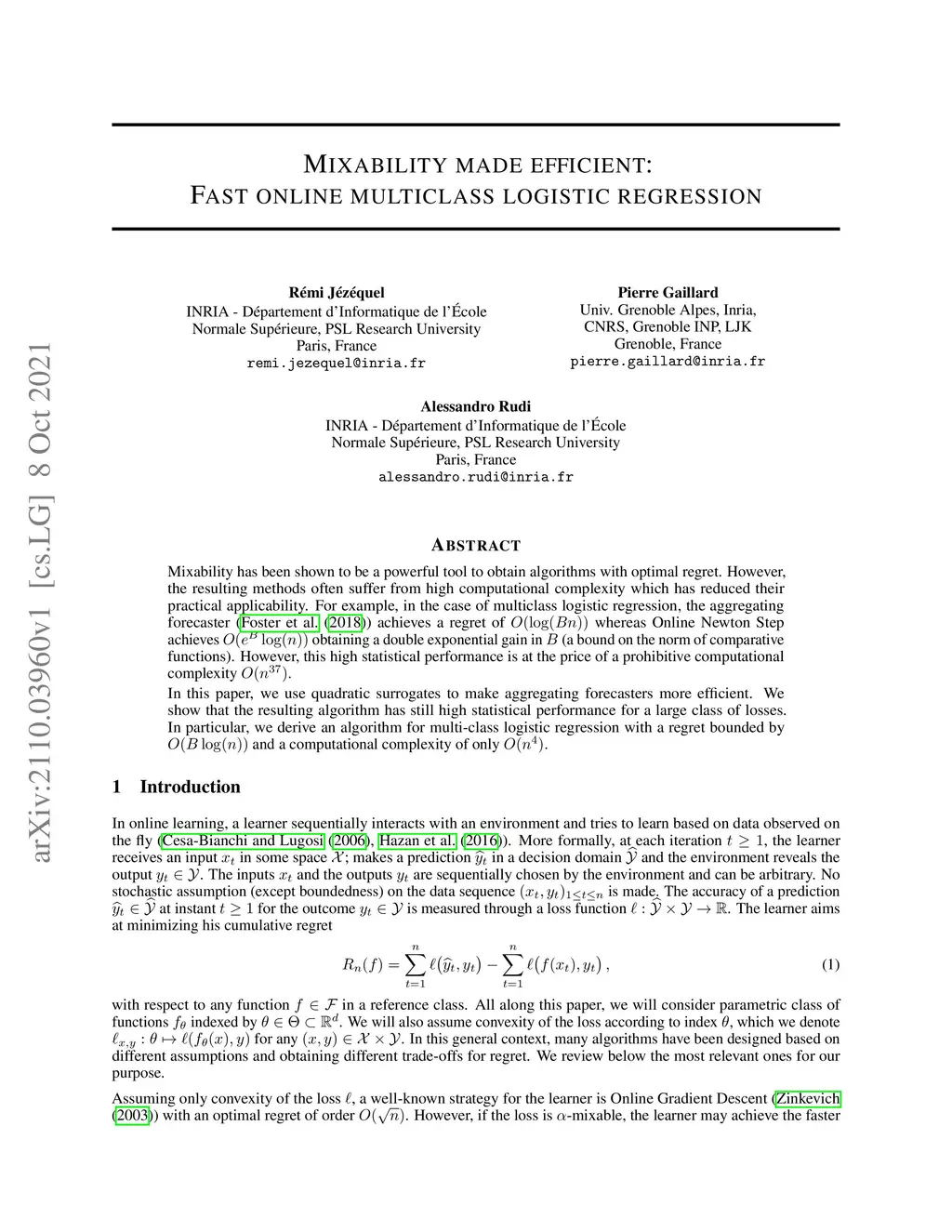 Mixability has been shown to be a powerful tool to obtain algorithms with optimal regret. However, the resulting methods often suffer from high computational complexity which has reduced their practical applicability. For example, in the case of multiclass logistic regression, the aggregating forecaster (Foster et al. (2018)) achieves a regret of whereas Online Newton Step achieves obtaining a double exponential gain in (a bound on the norm of comparative functions). However, this high statistical performance is at the price of a prohibitive computational complexity .