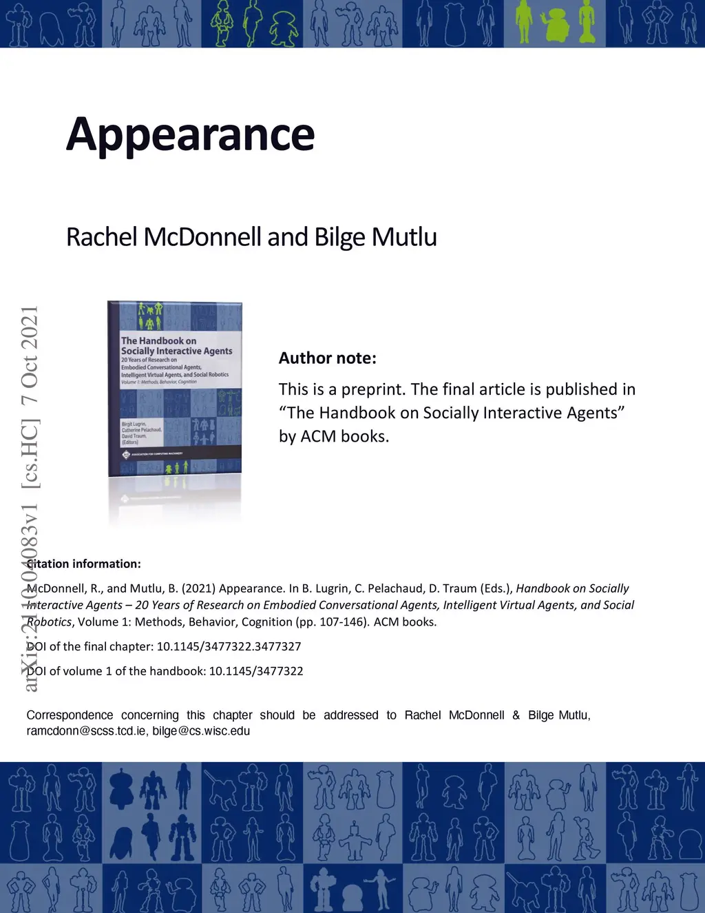Socially interactive agents (SIAs) are no longer mere visions for future user interfaces, as 20 years of research and technology development has enabled the use of virtual and physical agents in day-to-day interfaces and environments. This chapter of the ACM "The Handbook on Socially Interactive Agents" reviews research on and technologies involving socially interactive agents, including virtually embodied agents and physically embodied robots, focusing particularly on the appearance of socially interactive agents. It covers the history of the development of these technologies; outlines the design space for the appearance of agents, including what appearance comprises, modalities in which agents are presented, and how agents are constructed; and the features that agents use to support social interaction, including facial and bodily features, those that express demographic characteristics, and issues surrounding realism, appeal, and the uncanny valley. The chapter concludes with a brief discussion of open questions surrounding the appearance of socially interactive agents.