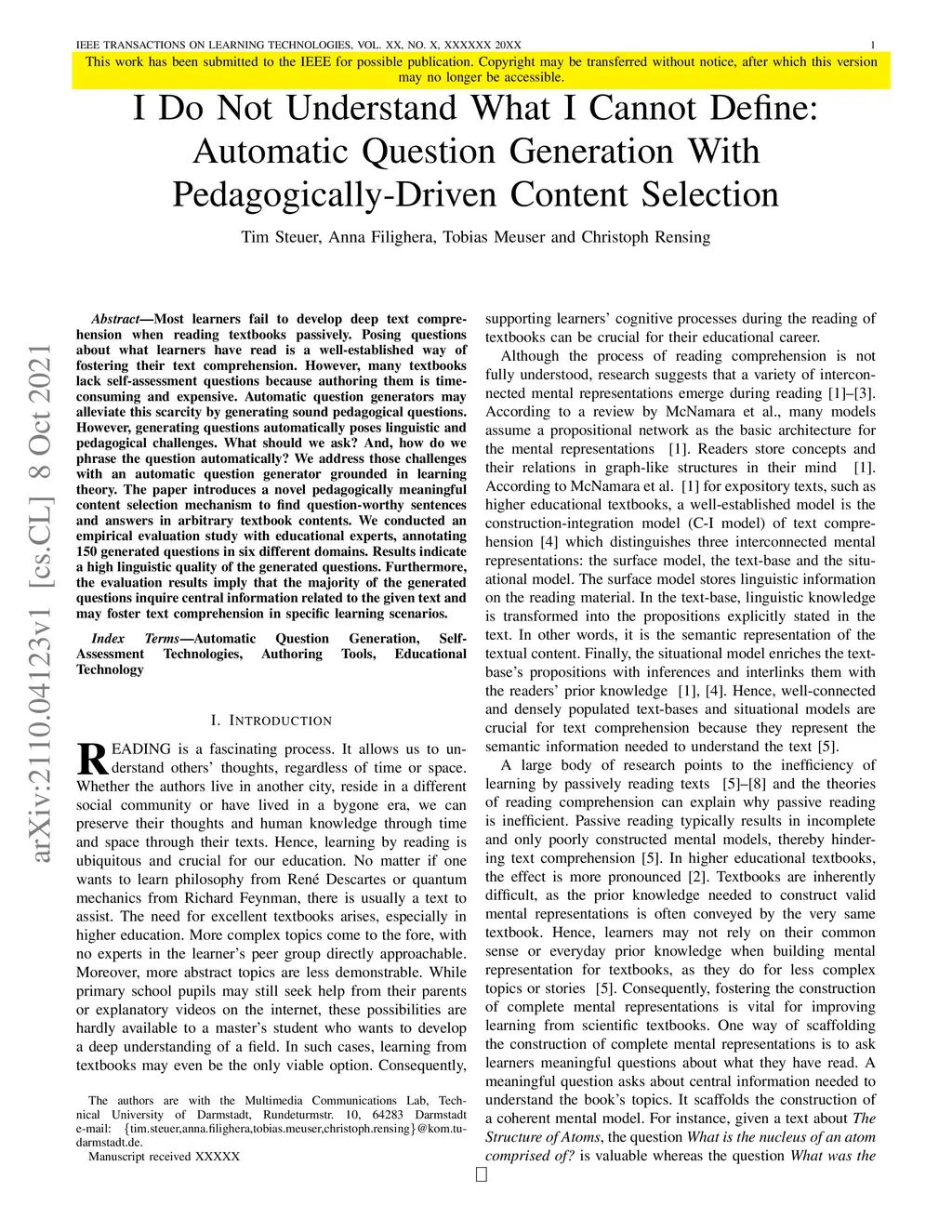I Do Not Understand What I Cannot Define: Automatic Question Generation