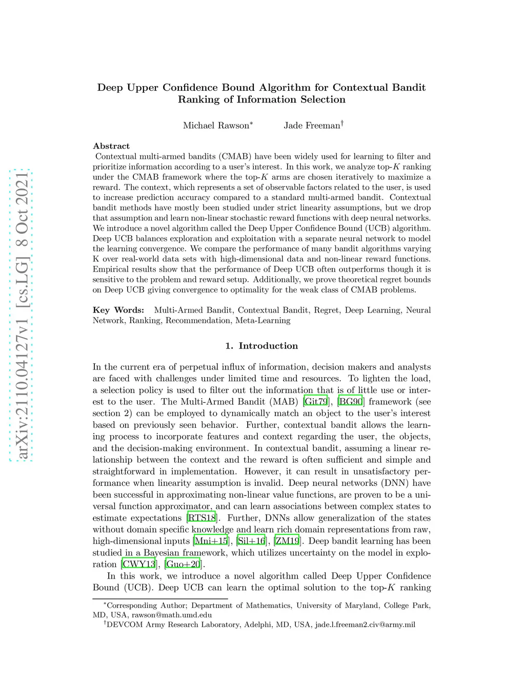 Deep Upper Confidence Bound Algorithm for Contextual Bandit Ranking of