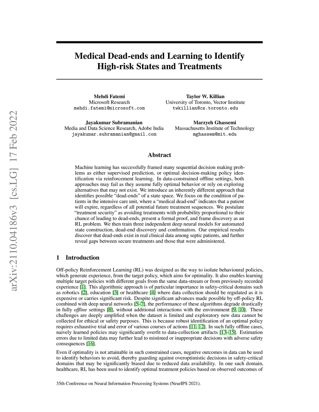 Machine learning has successfully framed many sequential decision making problems as either supervised prediction, or optimal decision-making policy identification via reinforcement learning. In data-constrained offline settings, both approaches may fail as they assume fully optimal behavior or rely on exploring alternatives that may not exist. We introduce an inherently different approach that identifies possible "dead-ends" of a state space. We focus on the condition of patients in the intensive care unit, where a "medical dead-end" indicates that a patient will expire, regardless of all potential future treatment sequences. We postulate "treatment security" as avoiding treatments with probability proportional to their chance of leading to dead-ends, present a formal proof, and frame discovery as an RL problem. We then train three independent deep neural models for automated state construction, dead-end discovery and confirmation. Our empirical results discover that dead-ends exist in real clinical data among septic patients, and further reveal gaps between secure treatments and those that were administered.