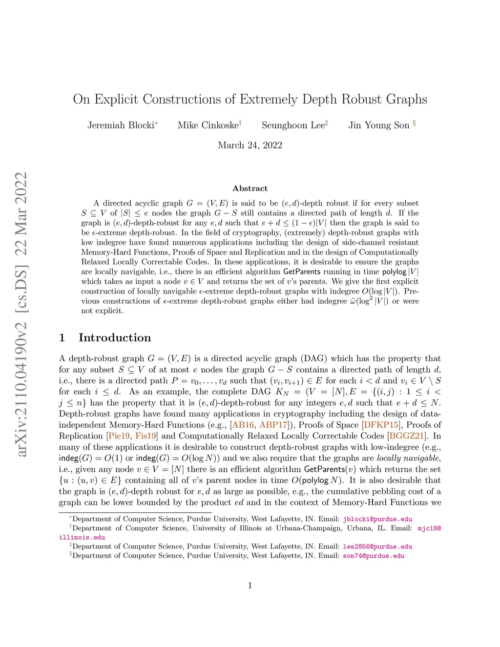 A directed acyclic graph is said to be -depth robust if for every subset of nodes the graph still contains a directed path of length . If the graph is -depth-robust for any such that then the graph is said to be -extreme depth-robust. In the field of cryptography, (extremely) depth-robust graphs with low indegree have found numerous applications including the design of side-channel resistant Memory-Hard Functions, Proofs of Space and Replication, and in the design of Computationally Relaxed Locally Correctable Codes. In these applications, it is desirable to ensure the graphs are locally navigable, i.e., there is an efficient algorithm running in time which takes as input a node and returns the set of 's parents. We give the first explicit construction of locally navigable -extreme depth-robust graphs with indegree . Previous constructions of -extreme depth-robust graphs either had indegree or were not explicit.